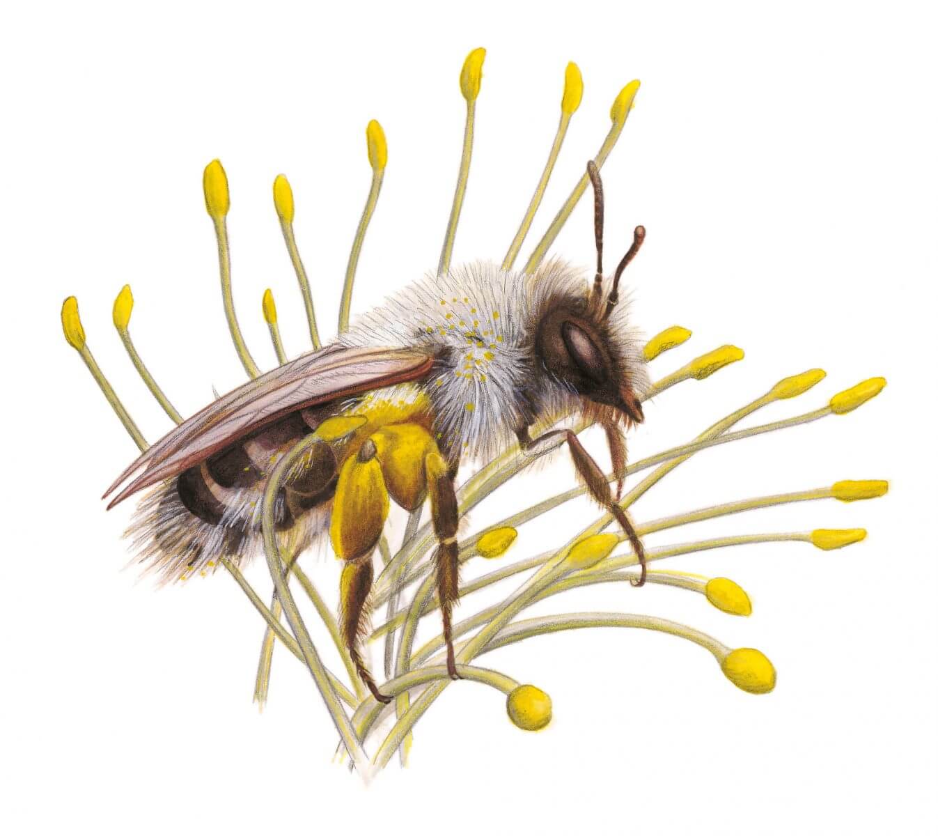 La mission des femelles est différente. A plusieurs centaines de mètres à la ronde, elles récoltent du pollen de saule puis le rapportent sur leurs pattes arrière. Elles façonnent alors ce trésor doré en boulettes qu’elles n’auront plus qu’à déposer une à une au fond d’une galerie sableuse, en compagnie d’un œuf. Fin avril déjà, le temps de ces abeilles est passé. Rendez-vous avec leurs descendantes l’année prochaine.