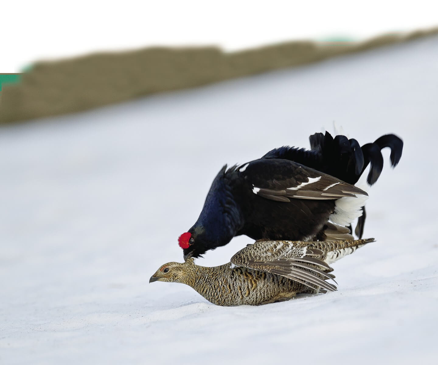 Entre avril et juin, le tétras lyre oublie la discrétion qui le caractérise habituellement. En mode séduction, les coqs se réunissent sur des arènes communes et s’affrontent à coups de chants et, si besoin, de bec. Leur but ? Démontrer leur suprématie et s’assurer les faveurs des poules qui assistent au spectacle. Les célèbres parades et leurs roucoulements commencent très tôt le matin et atteignent leur apogée au lever du soleil.
