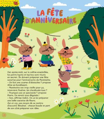 L’histoire : La fête d’anniversaire : Cet après-midi, les petits lapins et lapines sont réunis en secret. Ils doivent préparer une fête surprise pour l’anniversaire de Maminette. Sauf qu’ils n’arrivent pas à se mettre d’accord ! Chacun veut préparer son idée, de son côté. Mais… en fait… Qu’est-ce qui ferait vraiment plaisir à Maminette ? Une histoire à écouter aussi en podcast.