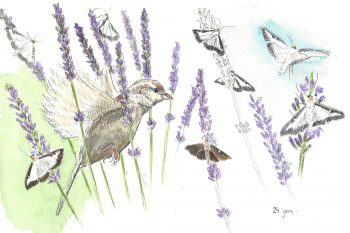 Dès que je m'éloigne, quelques moineaux prennent place à leur tour près de la belle aromatique provençale. Par de petits vols stationnaires au cœur des brins odorants, ils provoquent la fuite de dizaines de pyrales qu'ils gobent aussitôt. Voilà que mes voisins les piafs profitent de cette abondance pour se remplir le ventre et nourrir leurs jeunes par la même occasion !