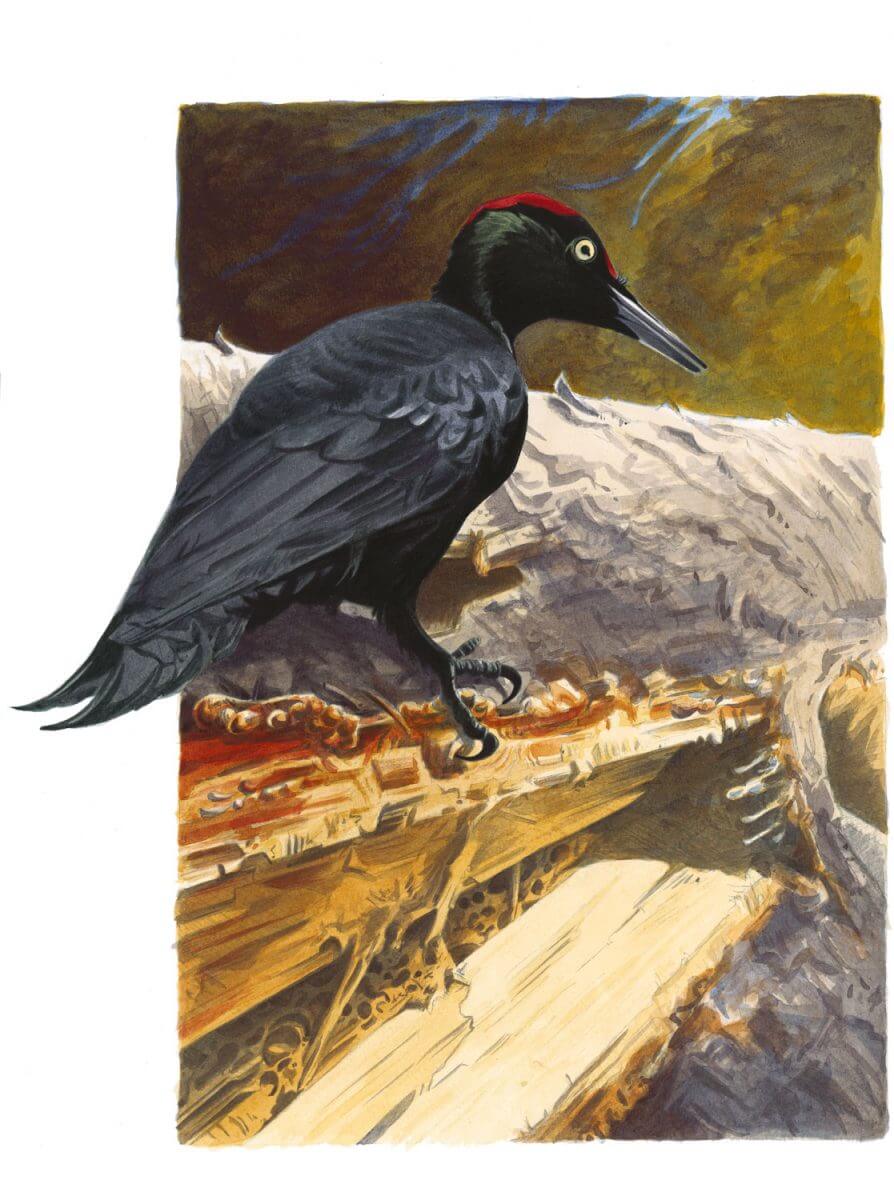 Que faut-il au bonheur de cet oiseau ? D’abord des conifères dépérissants attaqués par des larves d’insectes qu’il aura tôt fait d’empaler avec sa langue munie de barbes acérées. Ensuite quelques arbres apparemment sains mais rongés au cœur par des colonies de fourmis charpentières. A force de coups de bec, le pic noir est capable de réduire en charpie un tronc creusé par ces insectes.