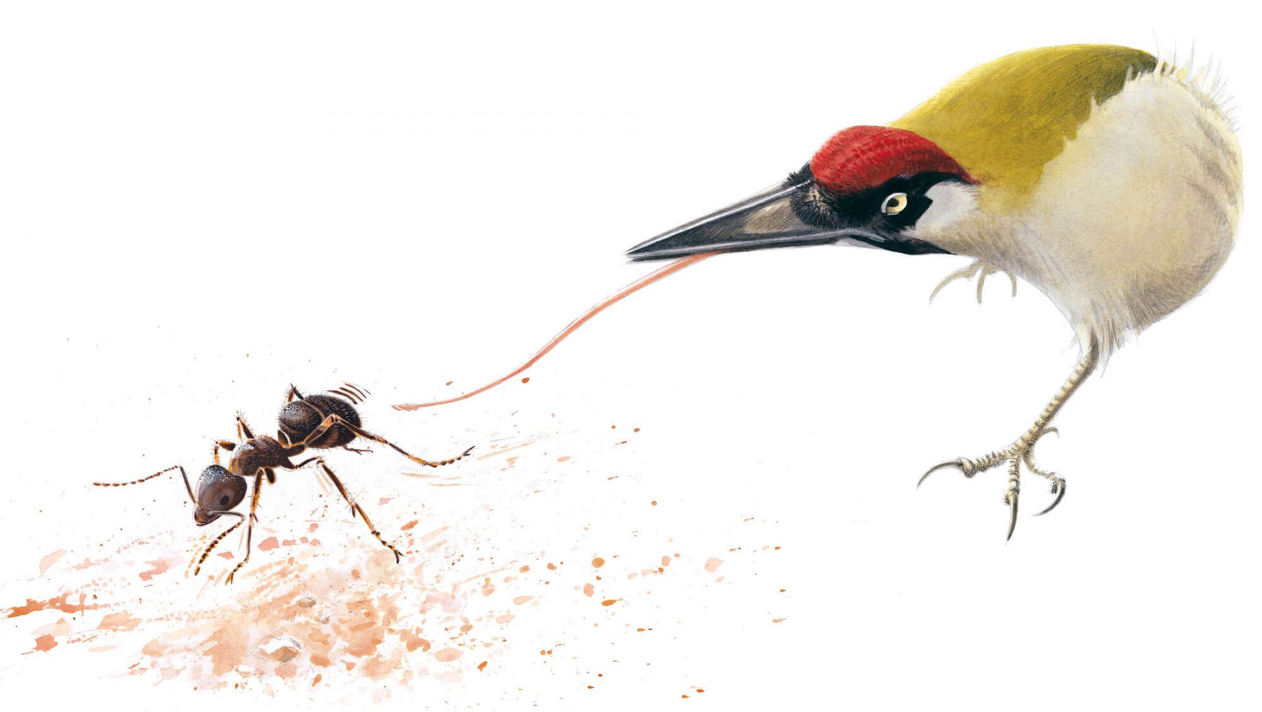 Sonore et coloré, voici pour commencer le plus célèbre des pics : le pic vert. N’allez pas chercher ce bel oiseau vert, jaune et rouge au plus profond des bois. Bien qu’il passe une partie de sa vie sur les troncs, le pic vert se nourrit dans l’herbe. Il s’y déplace par bonds et fouille la terre à la recherche de ses proies presque exclusives : les fourmis. Sa langue interminable peut être projetée jusqu’à 10 centimètres au-delà de la pointe du bec ! Cet organe préhensile, circulaire et gluant, s’insinue dans toutes les failles du sol, y compris les galeries de ses insectes préférés.