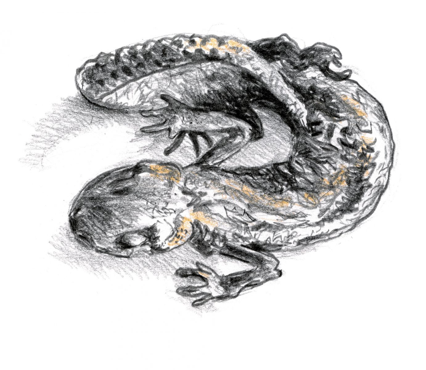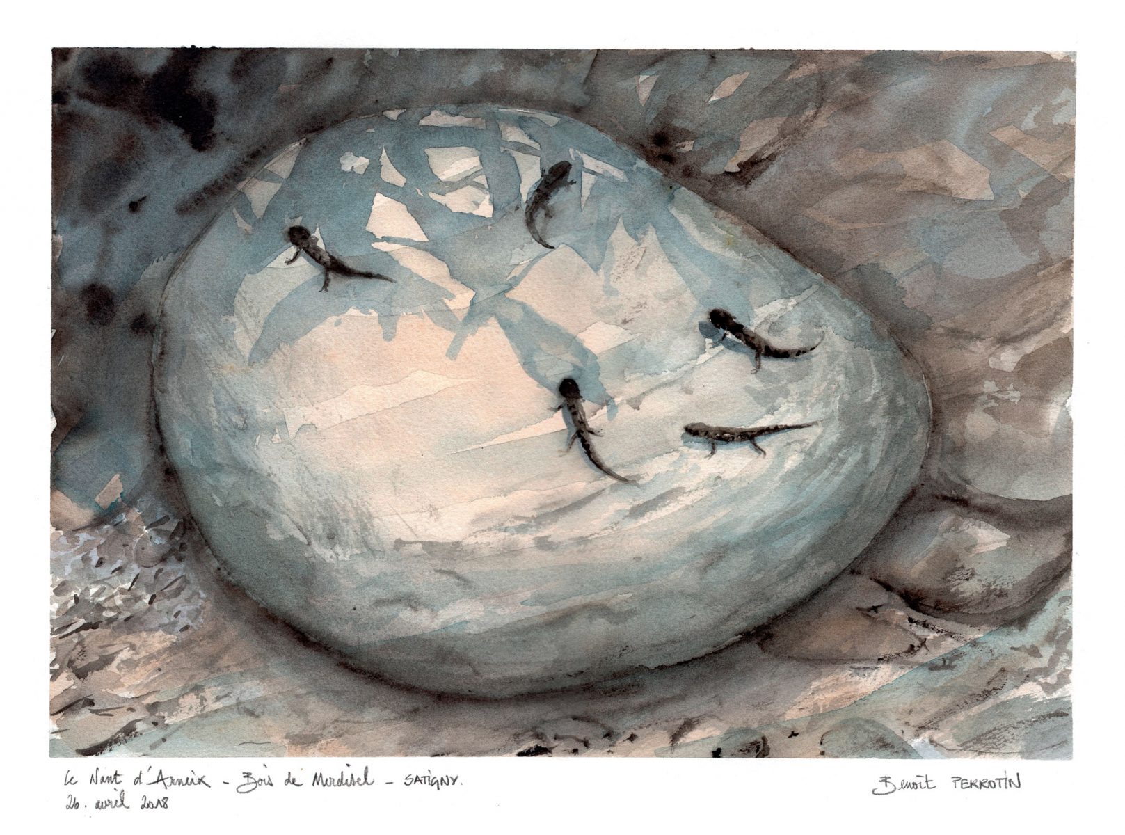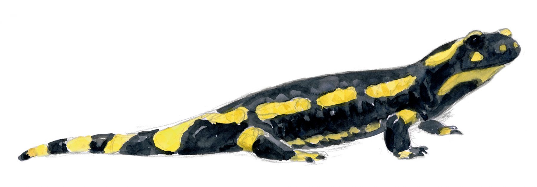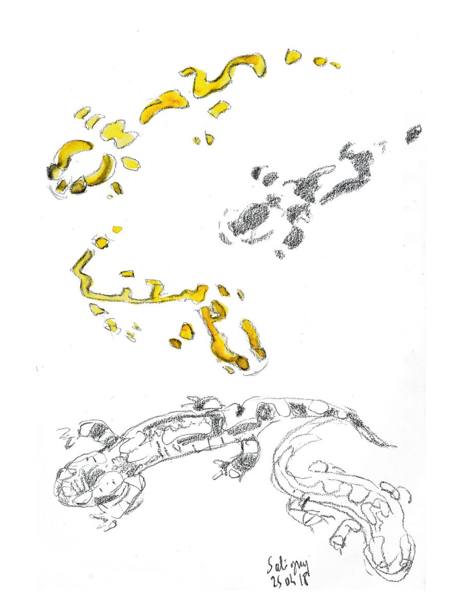 Un souvenir de salamandre ? En cherchant des chauves-souris dans d'anciennes mines, j'ai trouvé des salamandres au fond de la terre. Et même une fois des larves à plus de 200 mètres de l'entrée. Cet animal est un sujet sans limites pour le peintre.
