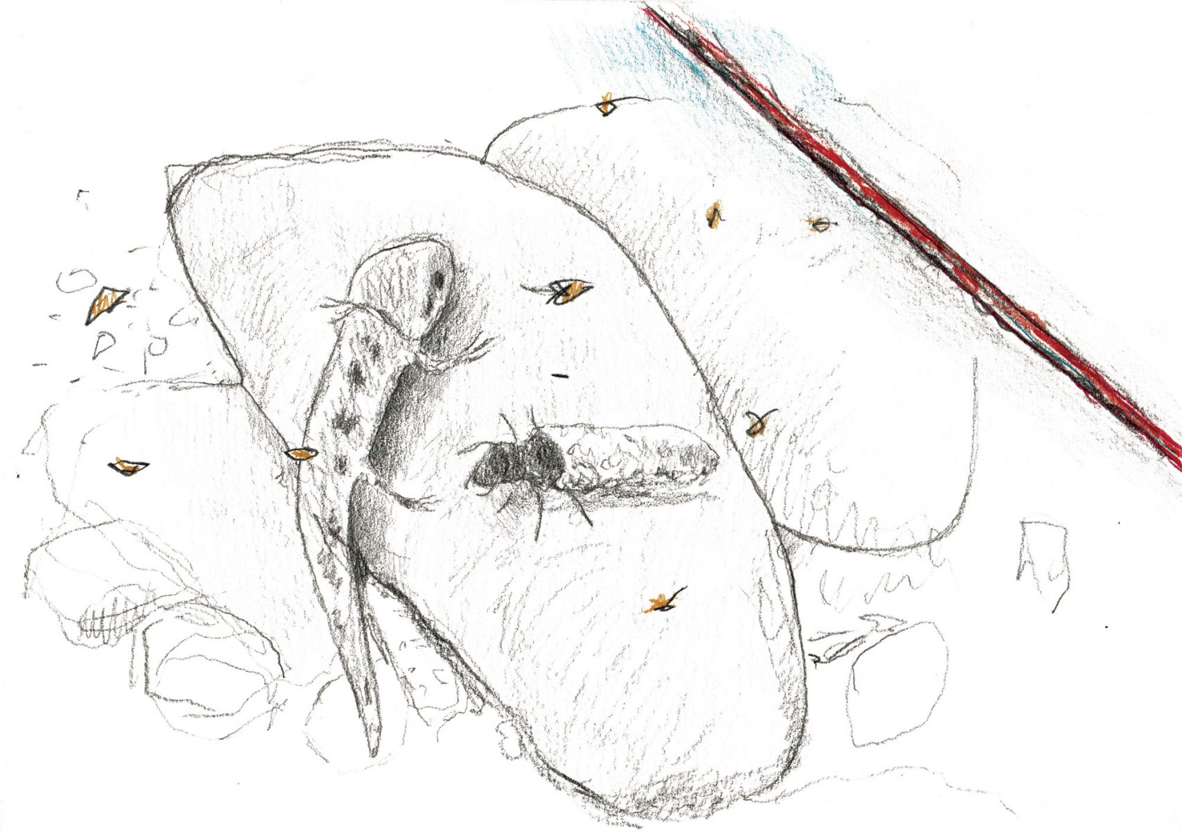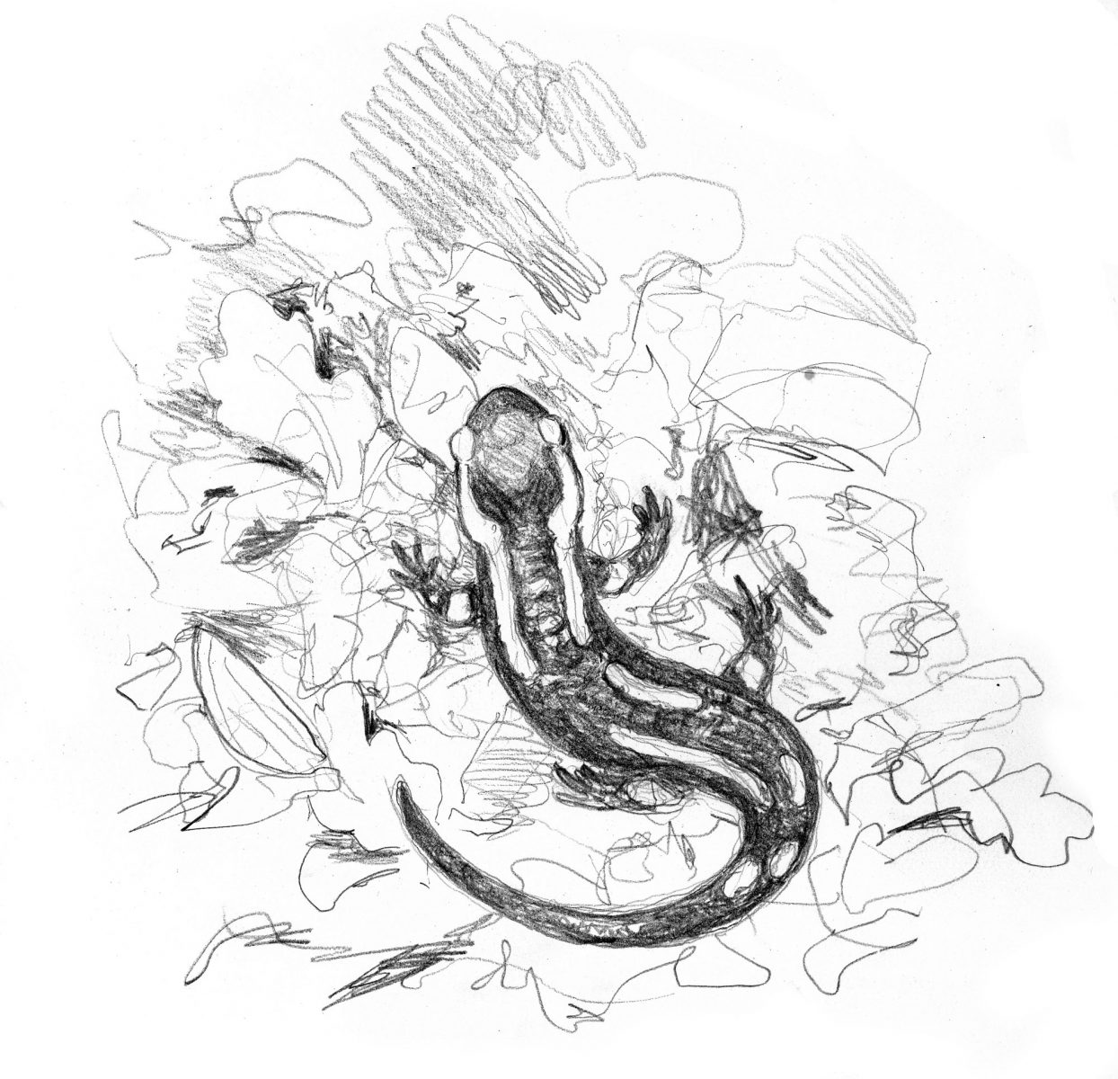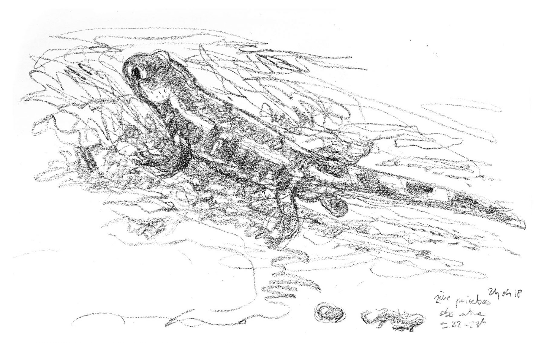 Un souvenir de salamandre ? C'est un rituel. En septembre, par temps doux et pluvieux, j'emmène mes deux loulous compter les salamandres en contrebas du village. Une fois, nous en avons dénombré 30 ! J'aime croquer cet animal singulier et tellement graphique.