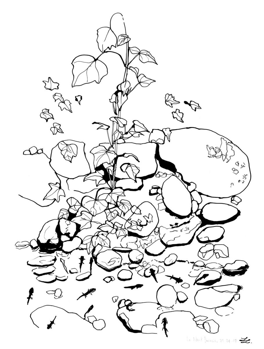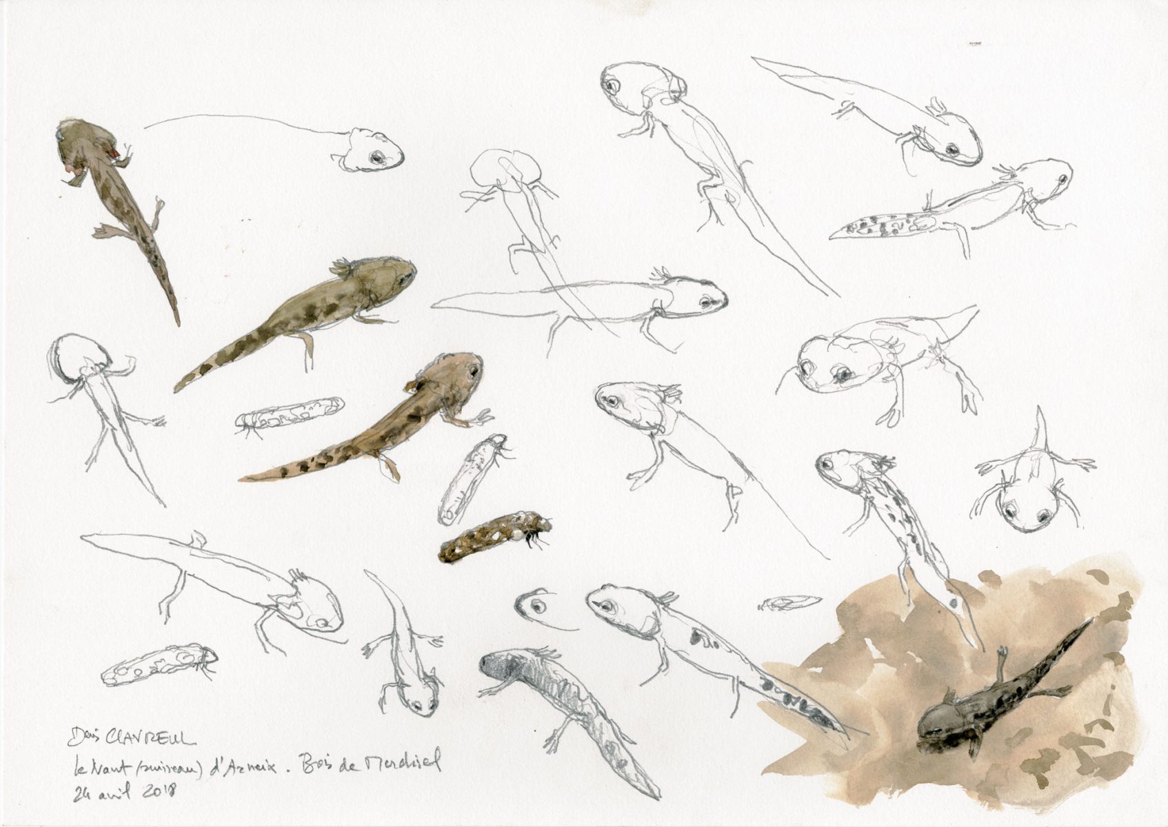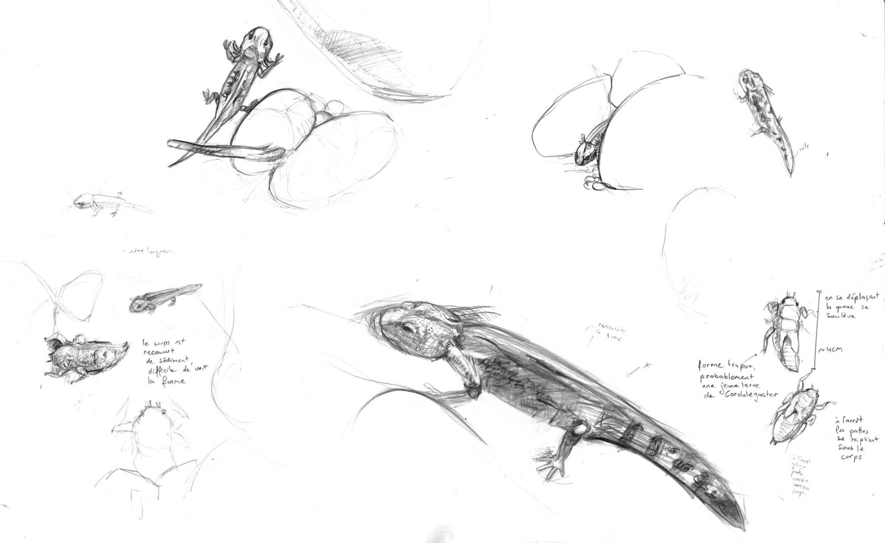 Un souvenir de salamandre ? Une bonne nuit de pluie durant le Festival de Ménigoute. Dans la forêt, il y avait une salamandre tous les 2 mètres. C'était chouette de les dessiner sous mon parapluie. Cet animal est fascinant graphiquement, ses yeux sont à la fois doux et mystérieux.