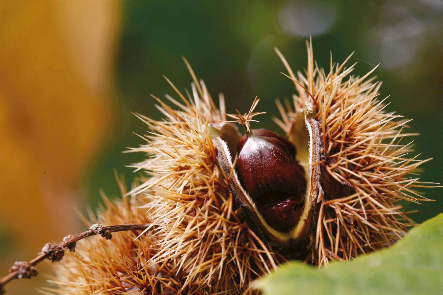 Qui s'y frotte s'y pique ! Sous son armure épineuse, la châtaigne dissimule de bien plus doux velours. L'intérieur de ses bogues est tapissé de poils moelleux. L'enveloppe de la graine possède aussi un revêtement de soie. Le fruit s'isole ainsi des grands froids et prépare sa sortie : les duvets protecteurs empêchent les parois de rester collées entre elles lorsque la bogue se fend.