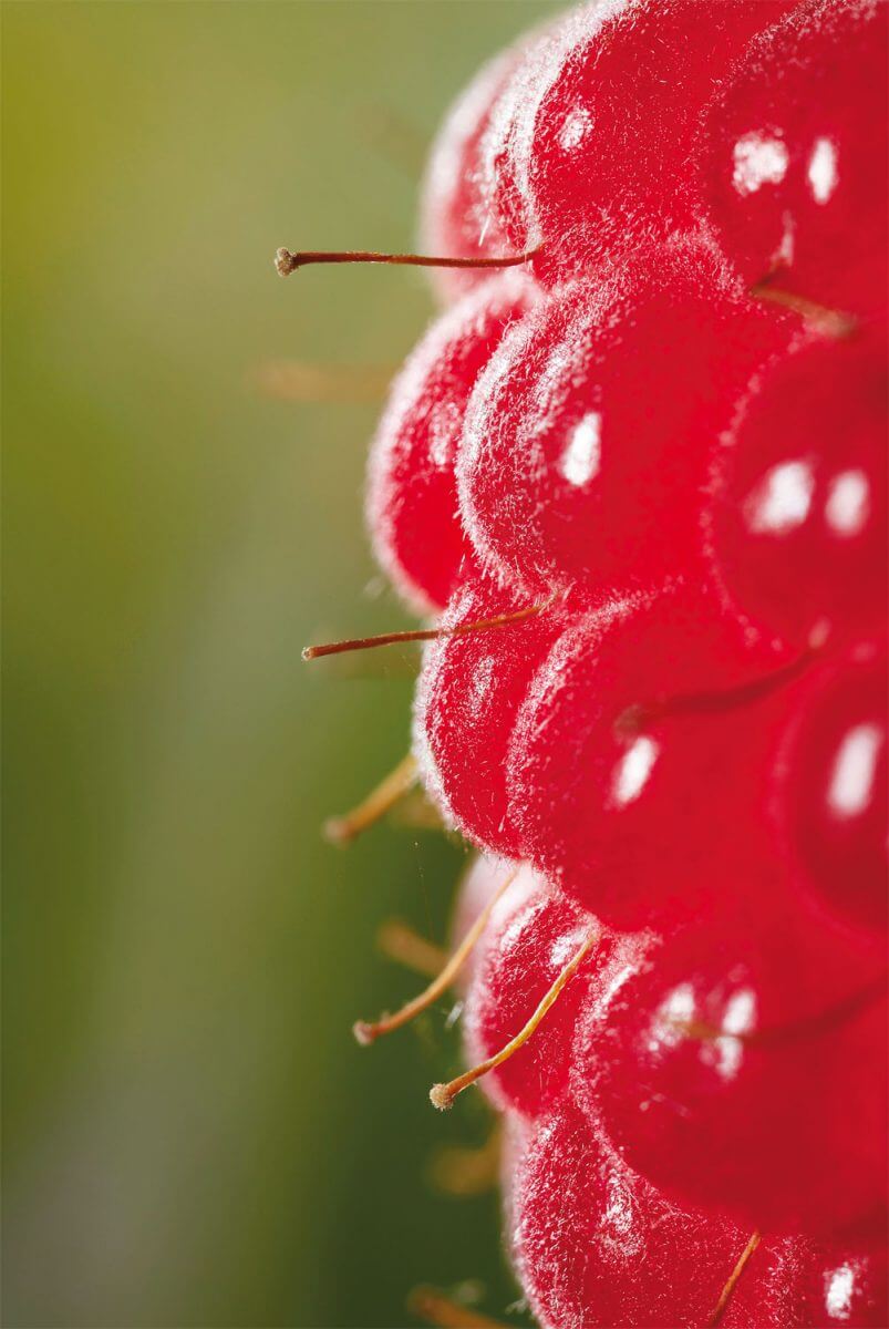 Un léger duvet recouvre les grains juteux de la framboise au milieu desquels persiste parfois un pistil desséché. Plus discrète que celle des pêches et des abricots, cette fine couche de poils contribue à la sensation veloutée qui accompagne en bouche le délicieux fruit rouge. Elle est surtout fort utile : en retenant l'air ; elle limite l'évaporation et les excès de température. De plus, en empêchant l'adhésion de l'eau de pluie et de la rosée, elle évite l'installation de moisissures et de bactéries.