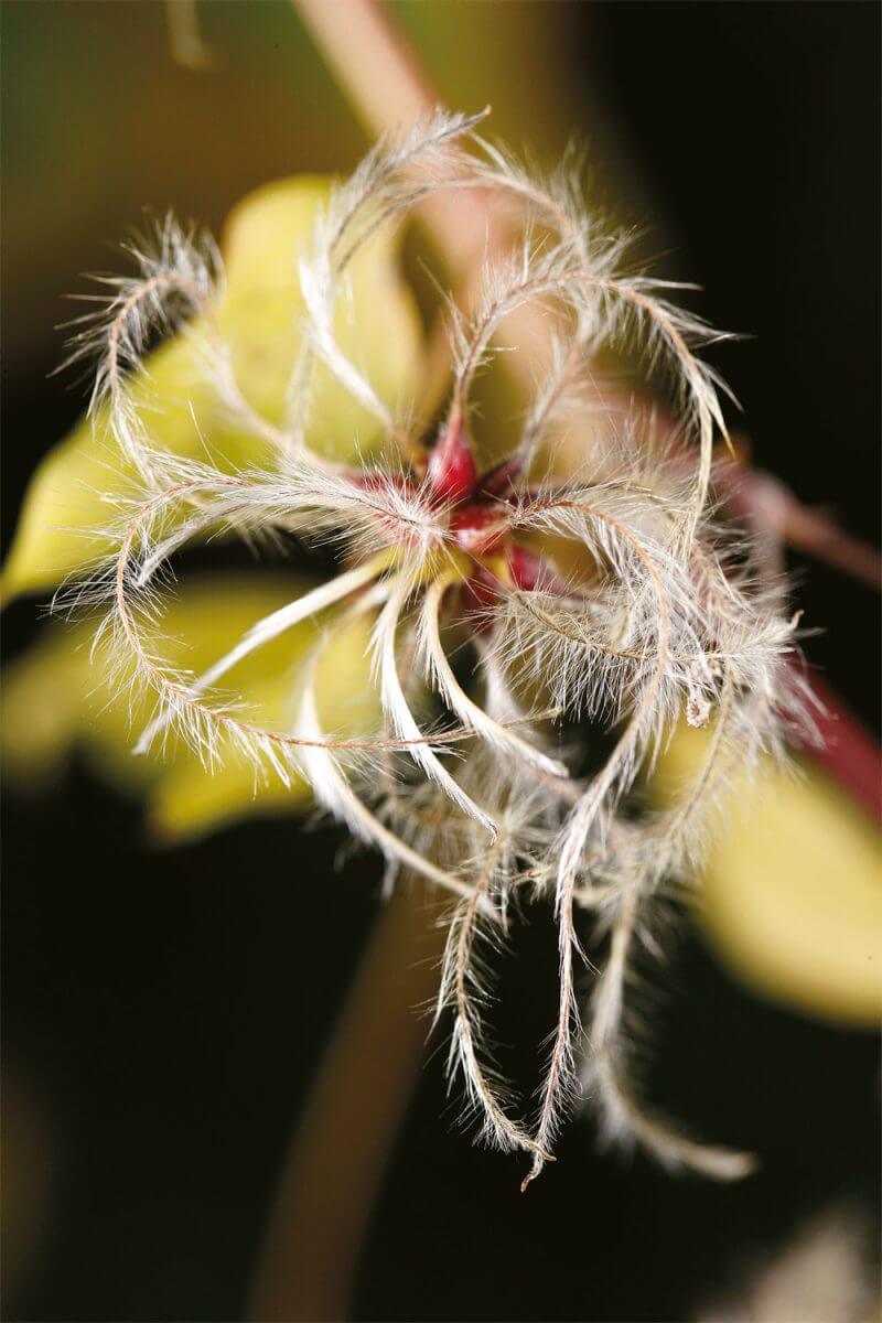 Véritables lianes, les clématites s'élancent de branche en branche, de buisson en arbuste et d'arbuste en arbre. Leurs graines munies d'une aigrette plumeuse sont réunies en tignasses ébouriffées. Le vent les emporte vers de propices humus. A moins qu'elles ne se laissent voguer sur une rivière en crue ou se prennent dans la fourrure d'un animal. Il leur arrive aussi de se faire véhiculer par un oiseau qui en garnira peut-être son nid.