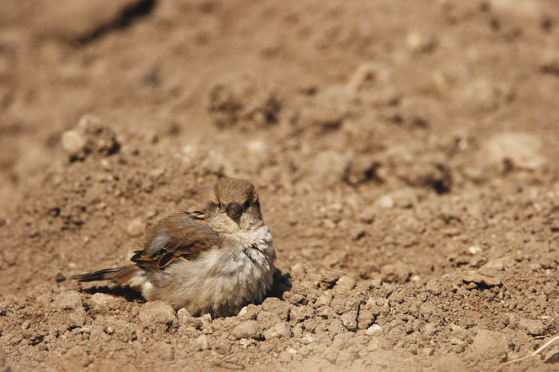 Une de leurs autres activités favorites est le bain de poussière. En groupes, les moineaux recherchent la moindre parcelle de terre nue du potager pour s’y lover et s’ébrouer de la plus felle façon, sans se soucier le moins du monde de dévaster dans la foulée les lignes de carottes fraîchement semées. Soyons tolérants, car les bains de poussière répondent à un besoin précis : ils permettent aux oiseaux de se débarrasser des parasites et contribuent à l’entretien du plumage. Les bains de fourmis jouent le même rôle: les projections d’acide formique des insectes en colère ont un effet insecticide sur les poux qui démangent les oiseaux.