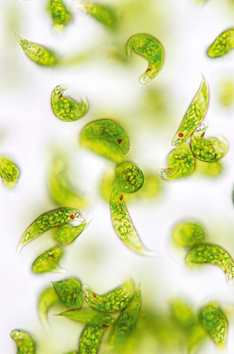 Drôle de chose que l’euglène. Cet être unicellulaire a un œil primitif, il se déplace, chasse des bactéries mais possède aussi des chloroplastes qui assurent la photosynthèse. Il peut perdre ces derniers mais continuer néanmoins sa petite vie. Alors, plante ou animal ? Question dépassée ! Aujourd’hui, la science considère au moins six règnes différents dont les protistes auxquels les euglènes sont rattachées.