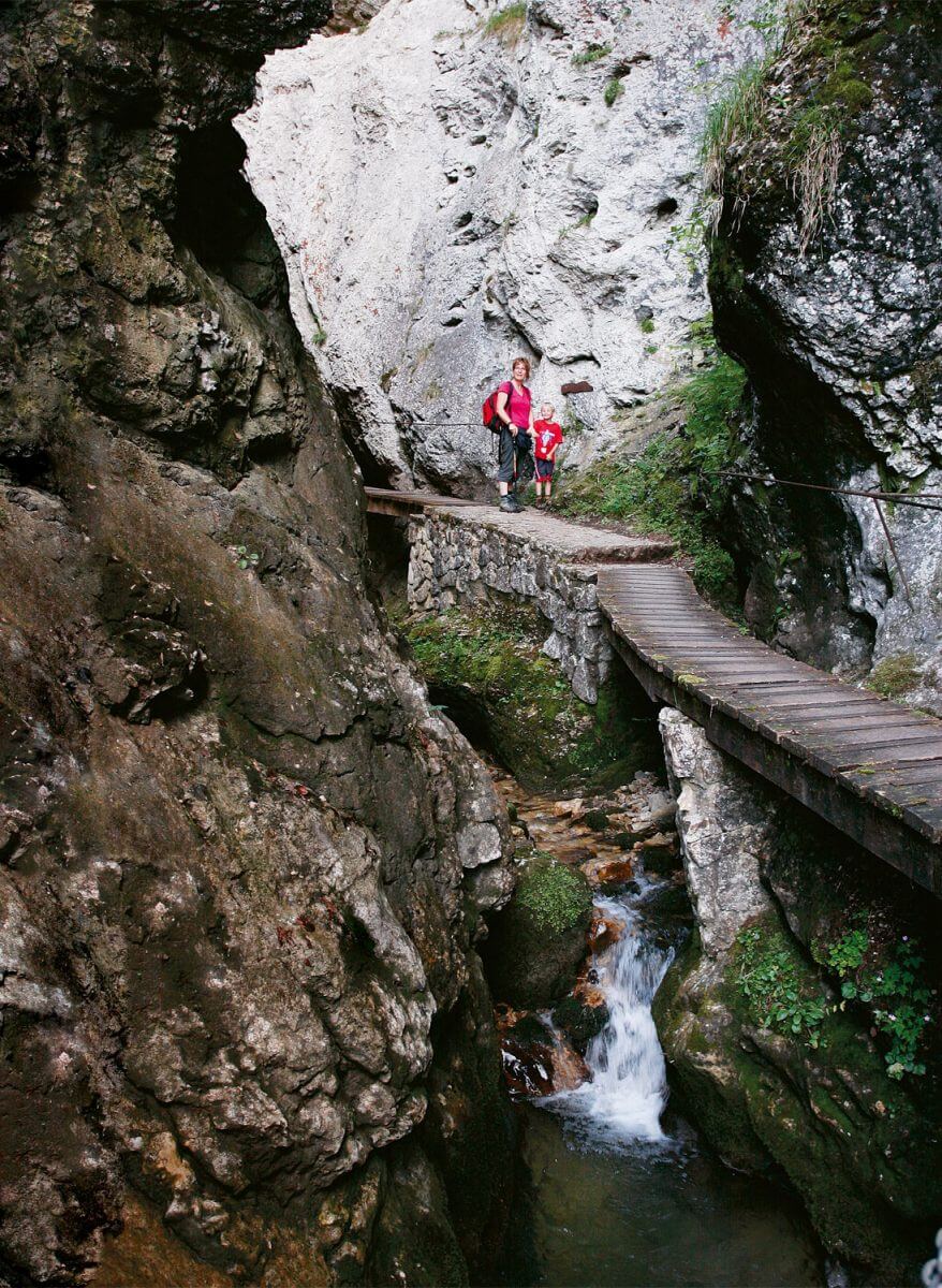 L’alpage m’avait offert de la hauteur, la forêt l’a reprise. Me voilà toute petite. La falaise de calcaire se dresse, impérieuse. Sa présence imposante annonce l’imminence des gorges. D’un coup, le sentier tranquille plonge dans le vertige du gouffre. Escaliers de pierre, passerelles et garde-fous épousent à merveille la physionomie des lieux. L’ancienne Société du Musée de Fleurier a aménagé l’accès au site au XIXe siècle. Détruits en 1980 par une forte tempête, ils ont été reconstruits depuis.
