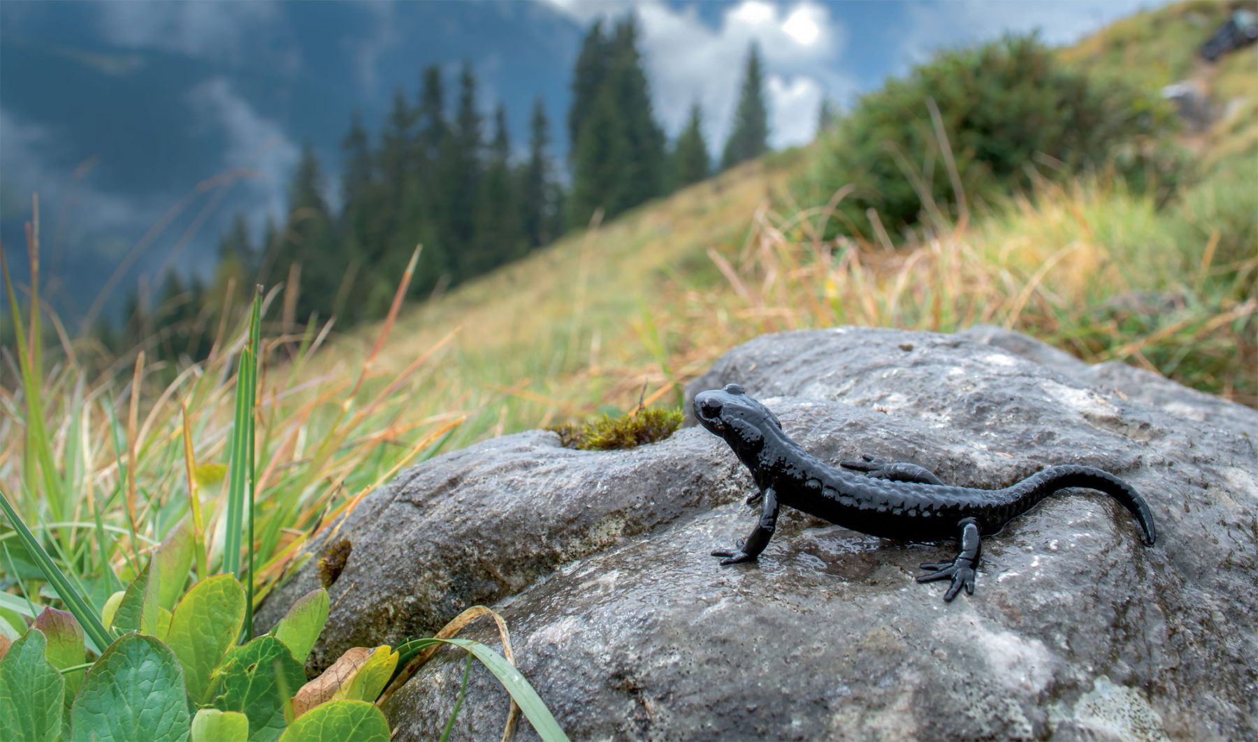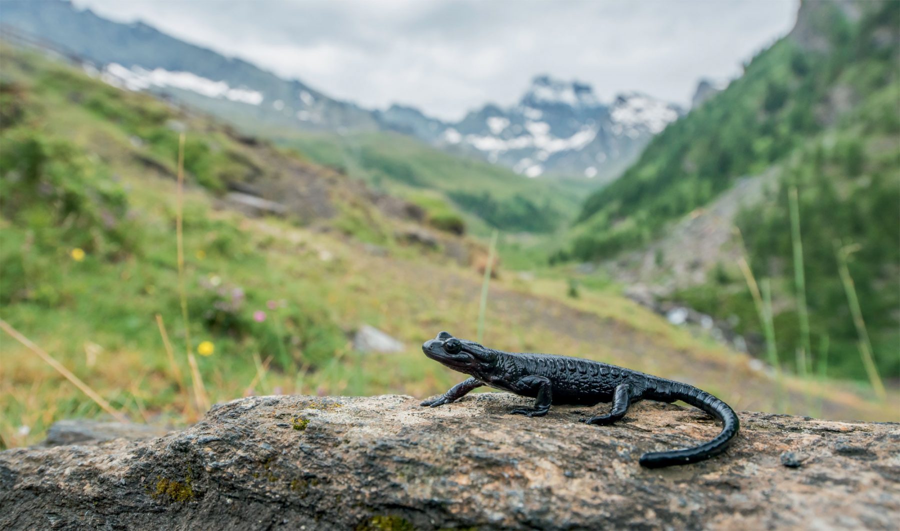 La première est répandue dans les Préalpes suisses mais très rare en Haute-Savoie. Plus fine et plus petite que sa cousine des plaines, plus vive aussi, plus souterraine encore, la salamandre noire se laisse parfois observer en grand nombre sous la pluie le long des sentiers de randonnée. Après une gestation qui peut durer jusqu'à cinq ans, la femelle vivipare donne naissance à deux jeunes parfaitement formés. Ajoutez à cela six ou sept ans pour devenir adulte et vous obtiendrez un animal fabuleux.