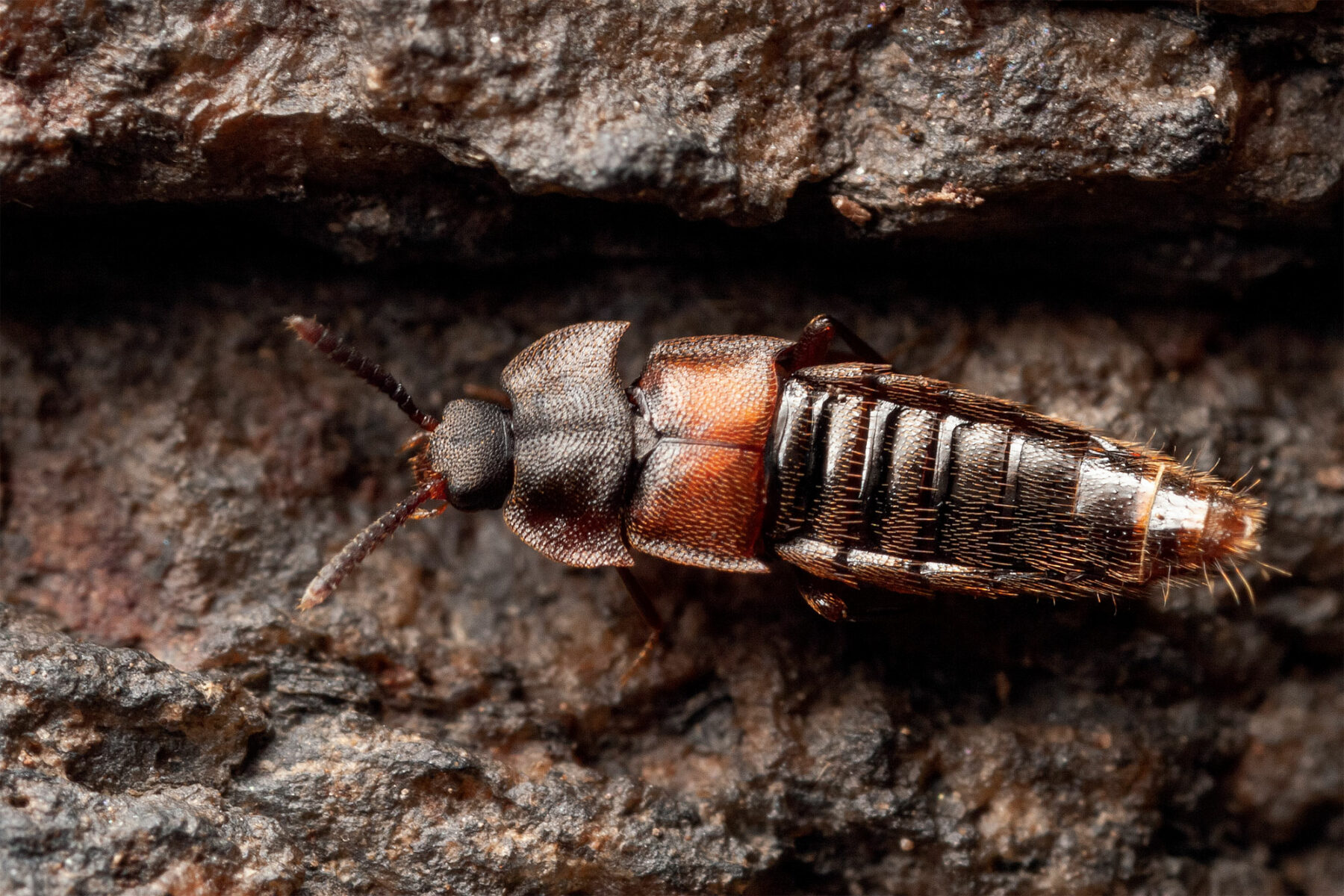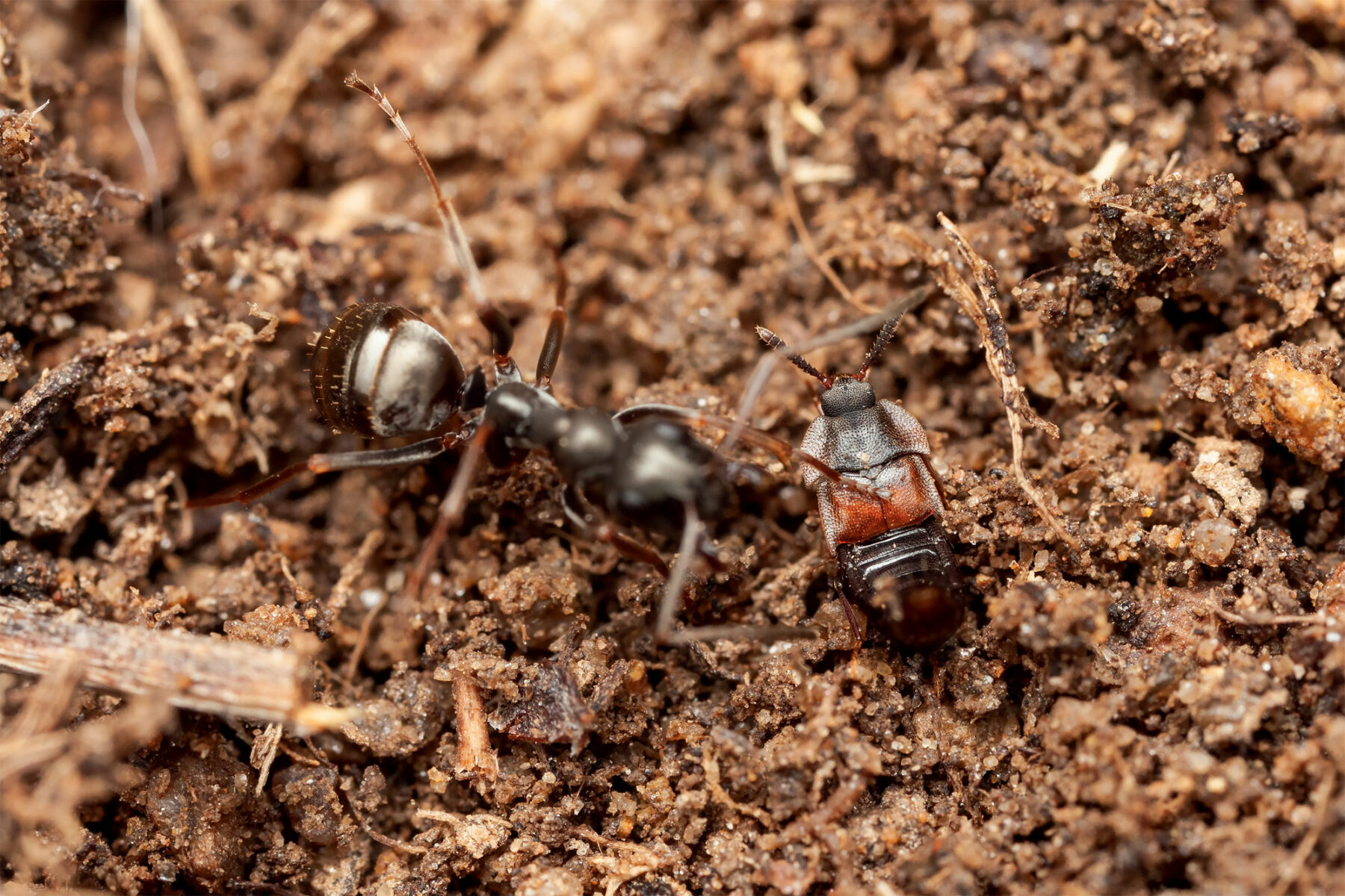 Certains insectes parviennent à se glisser à l’intérieur des cités de fourmis des bois pourtant bien gardées. Souvent des parasites, mais parfois aussi des squatters très utiles. Ainsi, les petits coléoptères Dinarda sont tolérés grâce à la sécrétion d’une substance calmante pour les ouvrières. Logés dans un gîte climatisé en toute saison, ils se nourrissent de fourmis mortes et d’autres déchets. Et surtout, ils chassent les acariens qui parasitent les fourmis. Le coléoptère se trouve en si bonne compagnie qu’il n’est pas rare de le voir suivre la colonie quand celle-ci déménage.