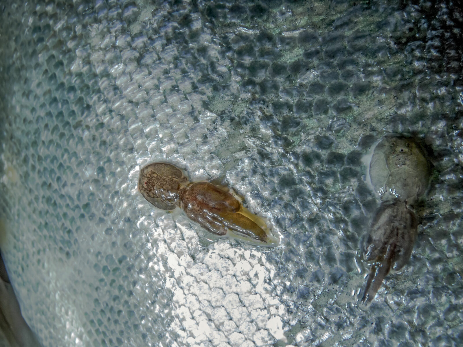 L’ennemi numéro un du saumon atlantique, ce sont les poux de mer, des crustacés copépodes qui passent leur vie adulte agrippés à son corps. Ils utilisent leur hôte comme taxi, sucent son mucus, parfois même son sang. En plus d’entraver ses déplacements, ils induisent un retard de croissance et peuvent lui transmettre certaines maladies. Un saumon infesté multiplie les bonds épuisants hors de l’eau pour se défaire de ses parasites.