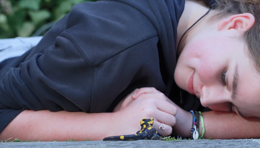 Elle nous raconte cette histoire qui a commencé il y a 4 ans, quand elle avait 10 ans : " Il y a souvent des salamandres devant la porte de la maison. Elles vivent dans un vieux mur et se cachent par moment sous des écorces de bois. Il y en a certaines qui sont toujours ensemble et je pense qu'elles vont à la rivière juste à côté.