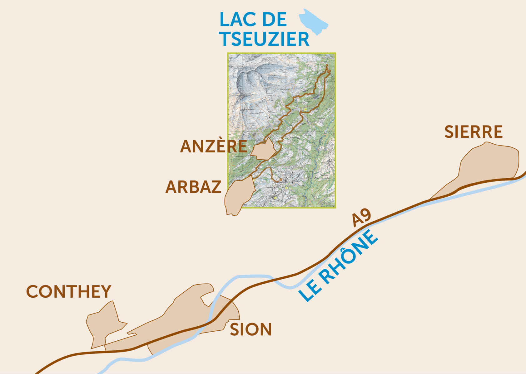 - Au-dessus de l'arrêt de car du Restaurant du Lac à Arbaz, prendre la route qui dessine un virage en épingle.