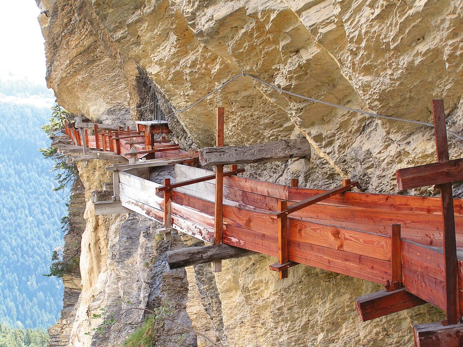 B) L'ancêtre du XIVe siècle « Construit vers 1307, le Bitailla (contraction de Bisse et de Tailla) est le plus ancien bisse du Valais. Son nom vient du fait qu'il est partiellement taillé dans la pierre. Le second itinéraire proposé ci-contre permet de le découvrir. Doté d'un répartiteur, il distribue l'eau vers les communes d'Arbaz et d'Ayent. Il s'agit d'un des seuls à demeurer en eau toute l'année. »