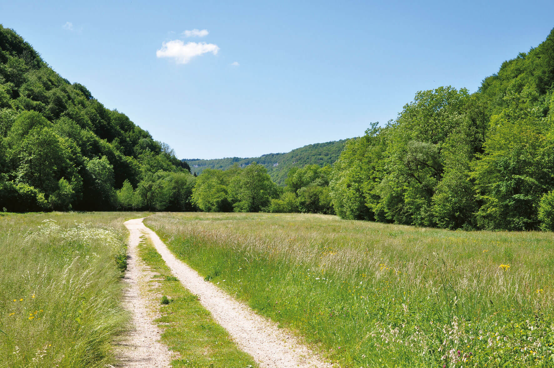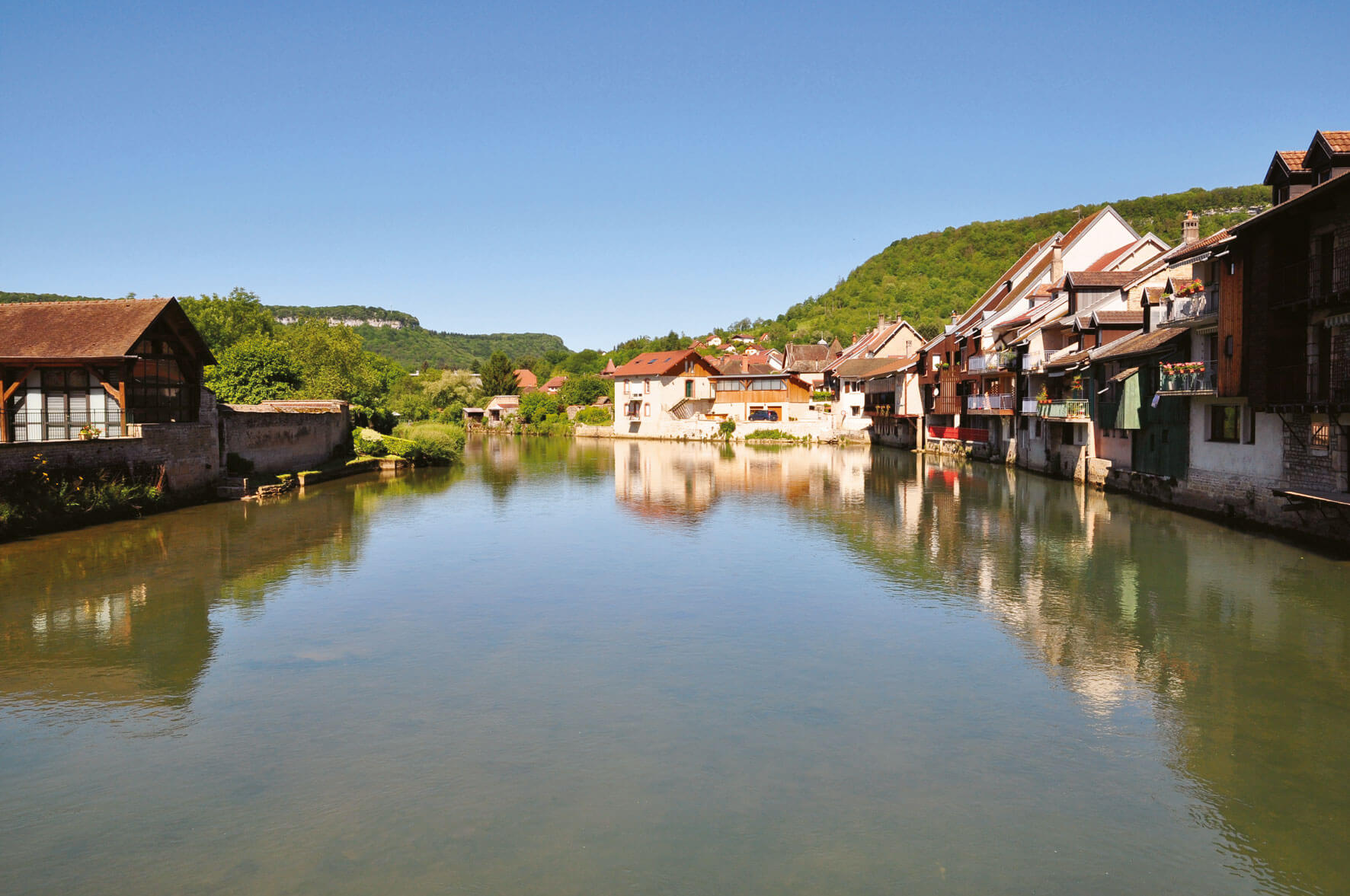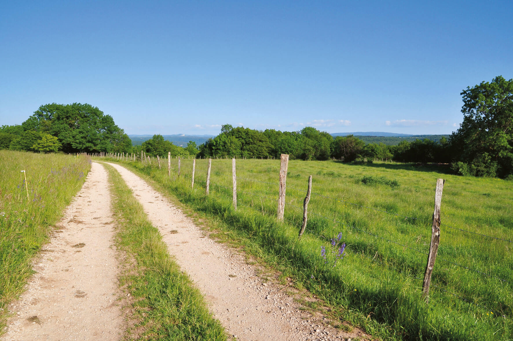 Sur le plateau, le sentier débouche sans transition dans des clairières fleuries et des prairies verdoyantes. Partout, des insectes crissent, bourdonnent, papillonnent. Etourdi par une profusion de lumière, de couleurs et de parfums, on est surpris de retrouver si vite la fraîcheur d'un ruisseau lorsque l'on redescend. La Brême, limpide rivière bordée d'arbres, court joyeusement vers la Loue.