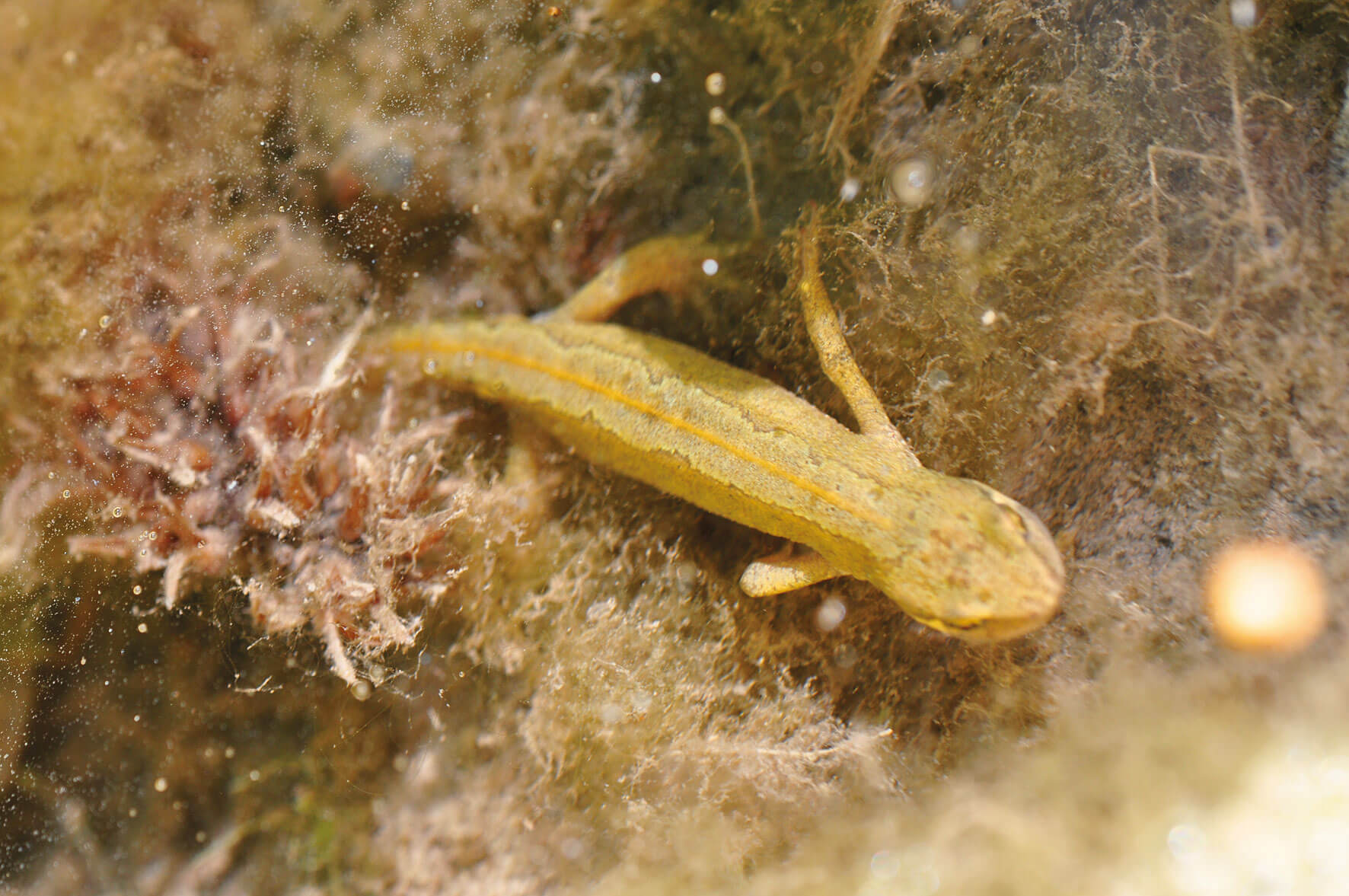 Laissées par la dernière averse dans les ornières du chemin, des flaques révèlent la présence d'un monde discret de fouines, blaireaux, chevreuils et chamois qui ont imprimé leur pas dans la boue. Là, au milieu d'une baignoire éphémère, deux pupilles en forme de cœur émergent et dévisagent le passant. Ces incroyables yeux dorés sont ceux du petit crapaud sonneur.