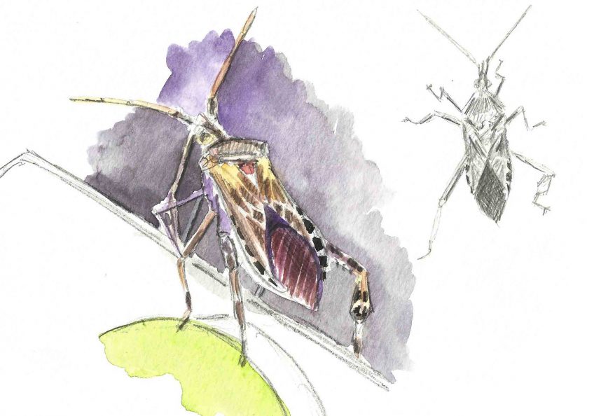 D'abord une, puis deux, puis cinq... et finalement une dizaine de punaises du pin se dorent la pilule autour des fenêtres de la façade sud de la maison. Allongée, brun rougeâtre et munie d'un long rostre fin qui lui donne son nom scientifique (lepto = grêle glossus = langue), la bête est phytophage et inoffensive. Elle n'en est pas moins la reine de l'incruste et on ne peut pas dire qu'elle sente la rose une fois dérangée.