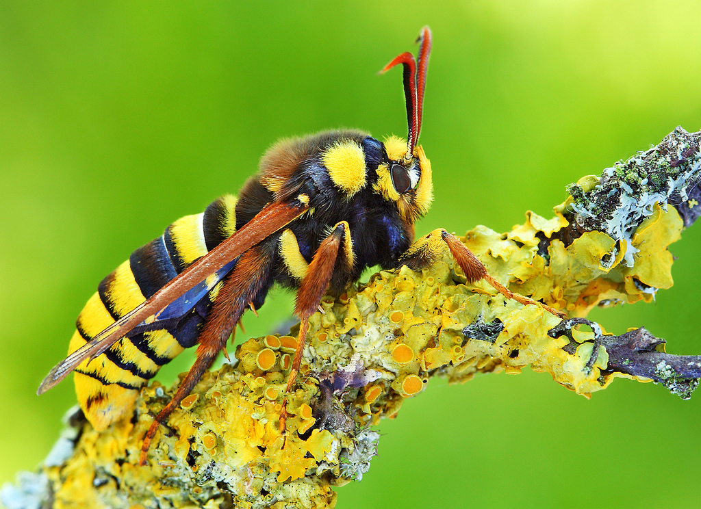 Jaune et noir, un signal visuel presque aussi fort que rouge et noir. De nombreux animaux associent ces deux teintes pour indiquer qu’ils sont toxiques, comme la salamandre tachetée. D’autres préviennent qu’ils peuvent piquer pour se défendre comme les guêpes ou les frelons. Un oiseau expérimenté se méfiera d’un insecte ainsi coloré… ce qui profite à la sésie apiforme. Ce papillon ressemble comme deux gouttes d’eau à une grosse guêpe. Et pourtant, il est incapable de piquer qui que ce soit.
