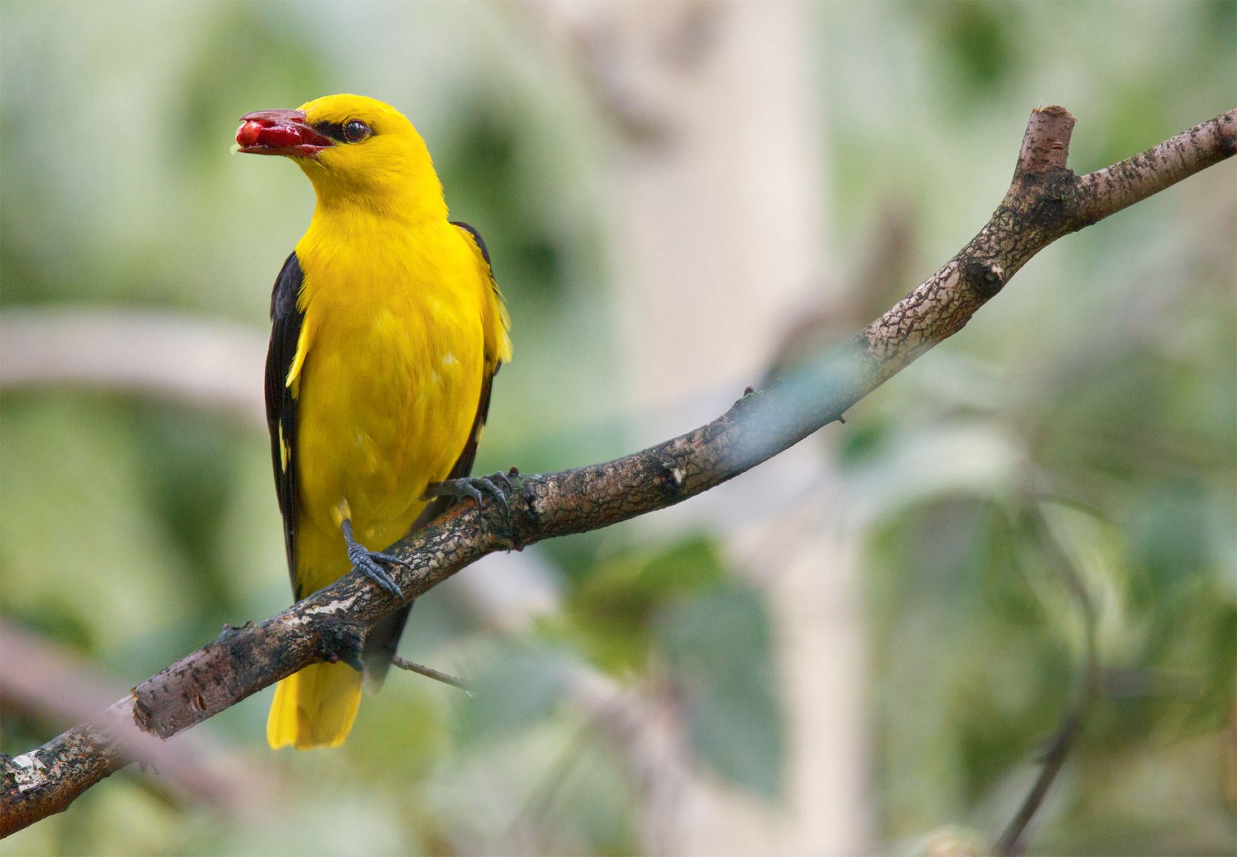 On dirait un oiseau tropical. Et d’ailleurs il ne séjourne chez nous que de mai à juillet. Le reste du temps, il le passe avec ses proches cousins exotiques en Afrique de l’Est. Le loriot d’Europe est une splendeur qui vit très discrètement dans la frondaison des arbres. Il est rare qu’on l’aperçoive. En général, on n’entend que le di-de-liou flûté du mâle. Cet insectivore au bec fin dévore des fruits dès qu’il le peut. Il a même une passion pour les cerises. Les pigments caroténoïdes qu’il trouve dans les fruits mûrs vont directement contribuer à l’éclat de son plumage. Et donc à son succès lors de la prochaine saison des amours.