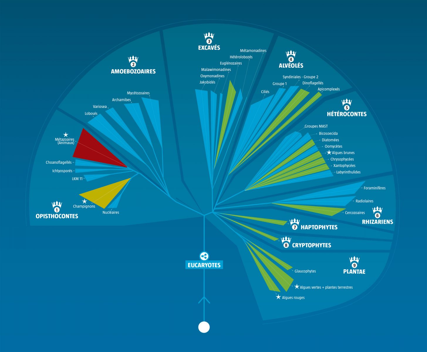 Rénové par la génétique, l’arbre de la vie compte neuf règnes. Cette classification moderne réserve trois surprises qui devraient inciter l’espèce humaine à plus de modestie :