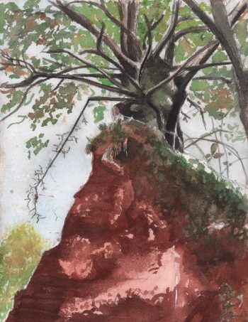 « Il pleut, je suis trempé, des nuances d'ocre tachent mes habits : je suis dans la région de Roussillon, pays des terres rouges et de l'huile d'olive. La pluie s'estompe, la forêt fume et luit, les gouttes glissent le long des feuilles. Une accalmie s'annonce. A la tombée de la nuit, je quitte les hauteurs avec l'aquarelle d'un paysage brumeux qui a du mal a sécher. Le crépuscule enveloppe ce monde féerique que je ne connais pas. Ici, le temps laisse ses marques: tous les arbres qui poussent sur les bords de falaises et les pics de terre rouge semblent avoir germé dans le vide, un peu plus haut que le niveau du sol. Leurs racines tortueuses luttent obstinément contre l'érosion de leurs supports. Un petit chêne étrange s'agrippe au sommet d'une paroi, l'image est fabuleuse, je ne peux m'empêcher de m'attarder quelques minutes en me promettant de revenir dessiner demain.»