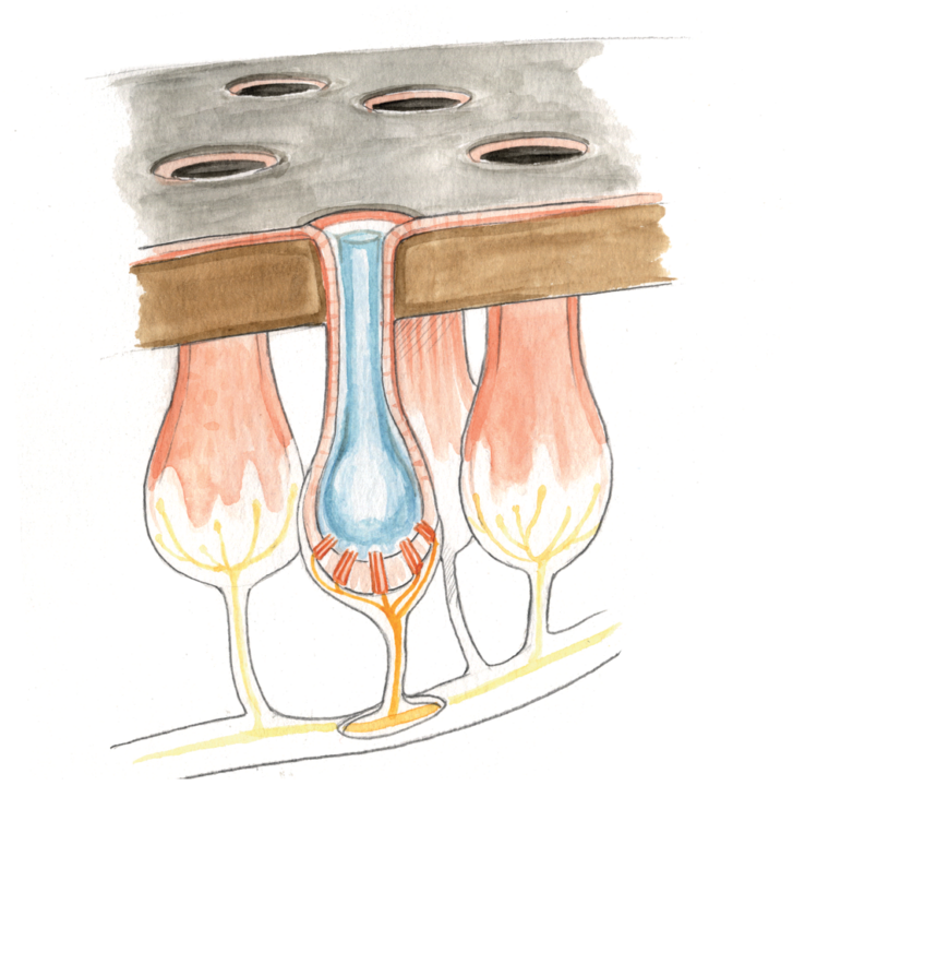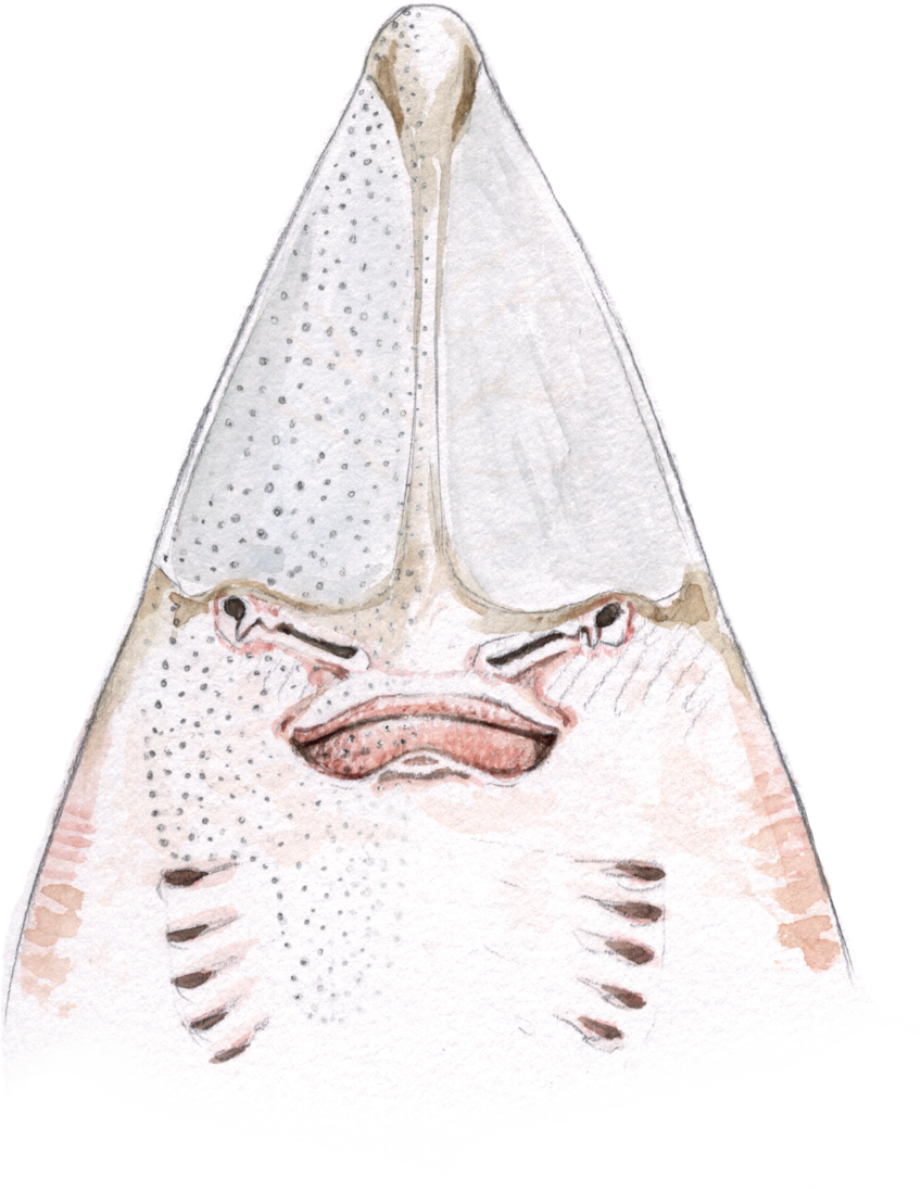 Organes sensoriels sur la face inférieure de la raie-guitare, au niveau du museau (grossis artificiellement sur le dessin).