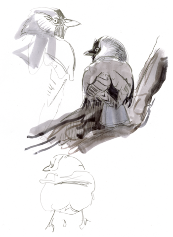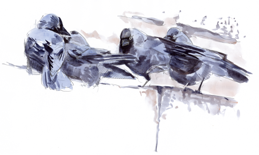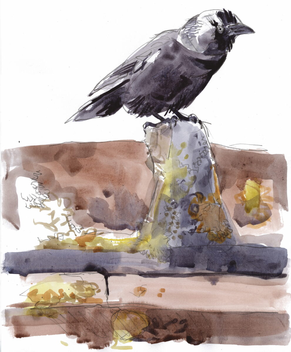 Mais le jackdaw des Anglais – étymologiquement, le corbeau qui fait tchaak ou le petit corbeau ordinaire nommé Jack – présente bien d’autres originalités… À commencer par son œil couleur ivoire, grisâtre ou bleu très clair. C’est ce qui fascine l’artiste ornithologue Nick Derry qui a illustré ce récit. Le choucas est l’un de ses oiseaux favoris depuis l’époque où il l’observait partout, au pays de Galles, lors de ses études.