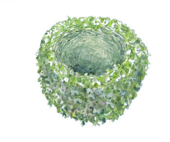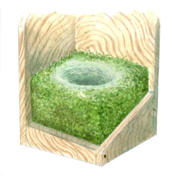 Un des nids les plus couramment retrouvés, en villes, campagnes et forêts. Souvent construit à moins de 3 m de hauteur, dans les buissons. En coupe volumineuse, composé de tiges, de brindilles et de beaucoup d’herbes sèches. Les rebords sont consolidés avec de la boue.