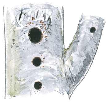 Trou rond, taille d’une balle de tennis, de 1 à 15 m du sol. Se démarque par une taille plus petite que la loge du pic noir (première loge sur le dessin ci-après).