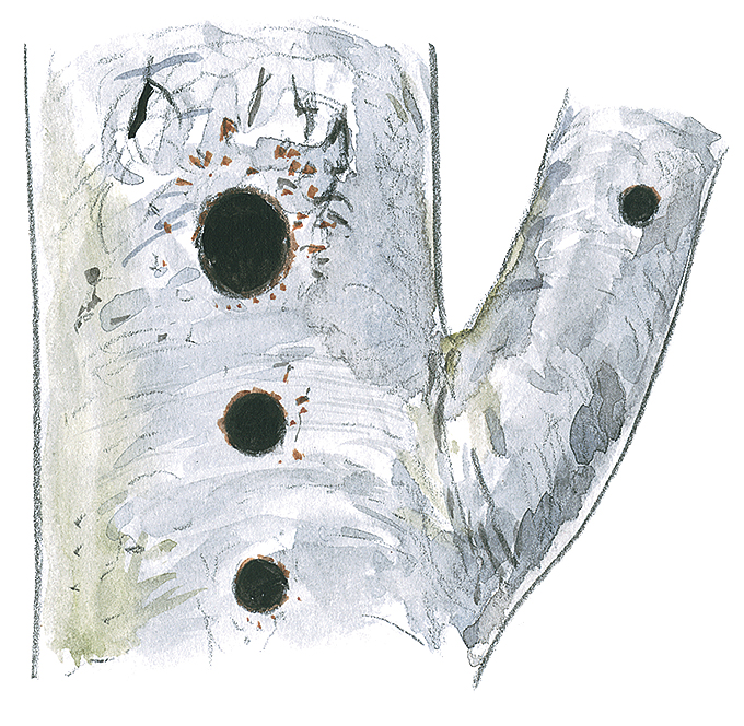 Trou rond, taille d’une balle de tennis, de 1 à 15 m du sol. Se démarque par une taille plus petite que la loge du pic noir (première loge sur le dessin ci-après).