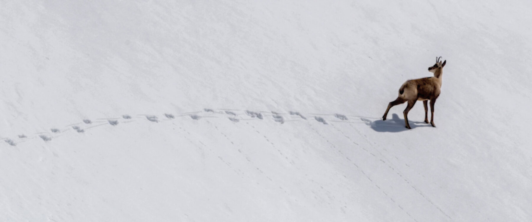 L'empreinte du chamois a une forme générale de poire dont les deux moitiés sont bien écartées dans la neige. Souvent, il laisse un peu traîner les ongles.
