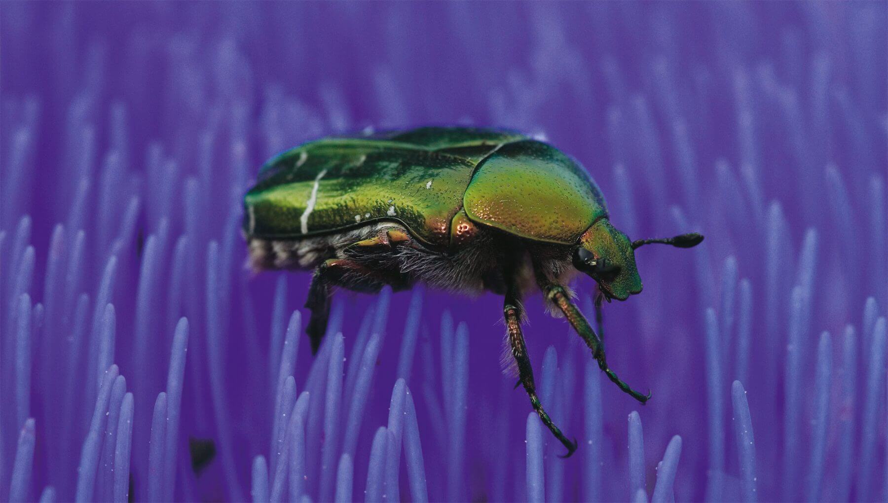 Les coléoptères comme cette cétoine sont les plus anciens insectes pollinisateurs. Peu agiles, ils ont besoin pour se poser d’une large piste d’atterrissage : ombelles du sureau ou de la carotte, corolles de l’églantier ou du nénuphar. Certains dévorent tout ce qu’ils trouvent, d’autres se concentrent sur le nectar, que parfois ils pompent avec une courte trompe. Quelques-uns enfin ont développé des brosses ou des cuillères à pollen.