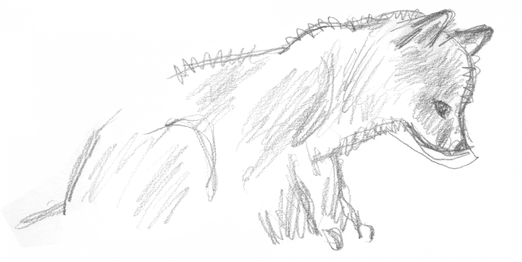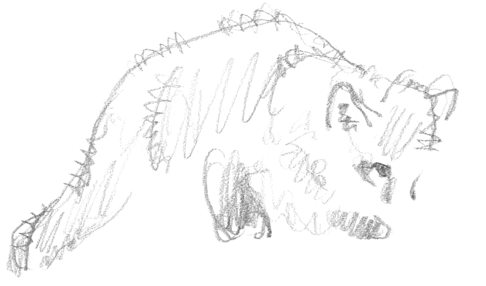 Il y a ce grand mâle qui sort seul de son trou bien avant la nuit. Il a les yeux bridés, les sourcils clairs et un masque foncé autour des yeux. Il s’assied, observe un moment puis se déplace jusqu’à la souche. Là, il tourne sur lui-même à la façon d’un chien, se couche et s’endort, le museau enfoui dans la fourrure de sa queue. Plus tard, il se réveille et bâille plusieurs fois en montrant une jolie couronne de dents blanches et sa langue toute rose. Puis s’en va tranquillement à la nuit.