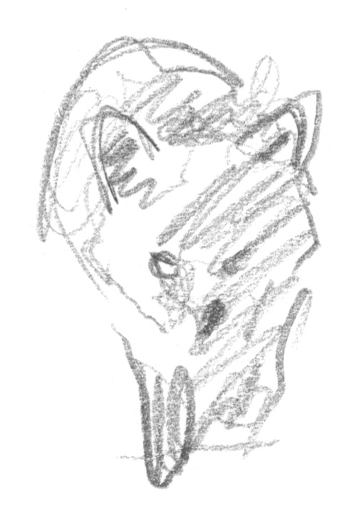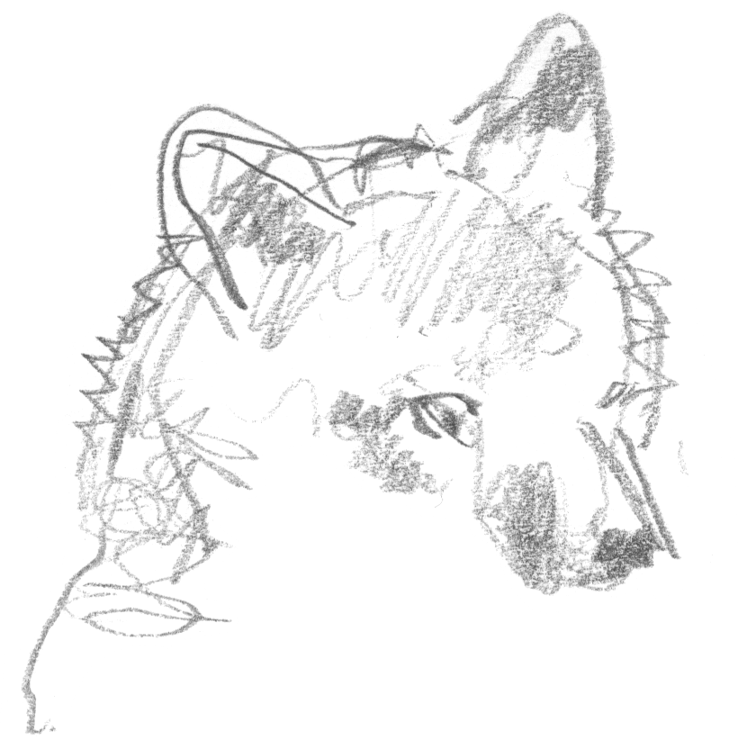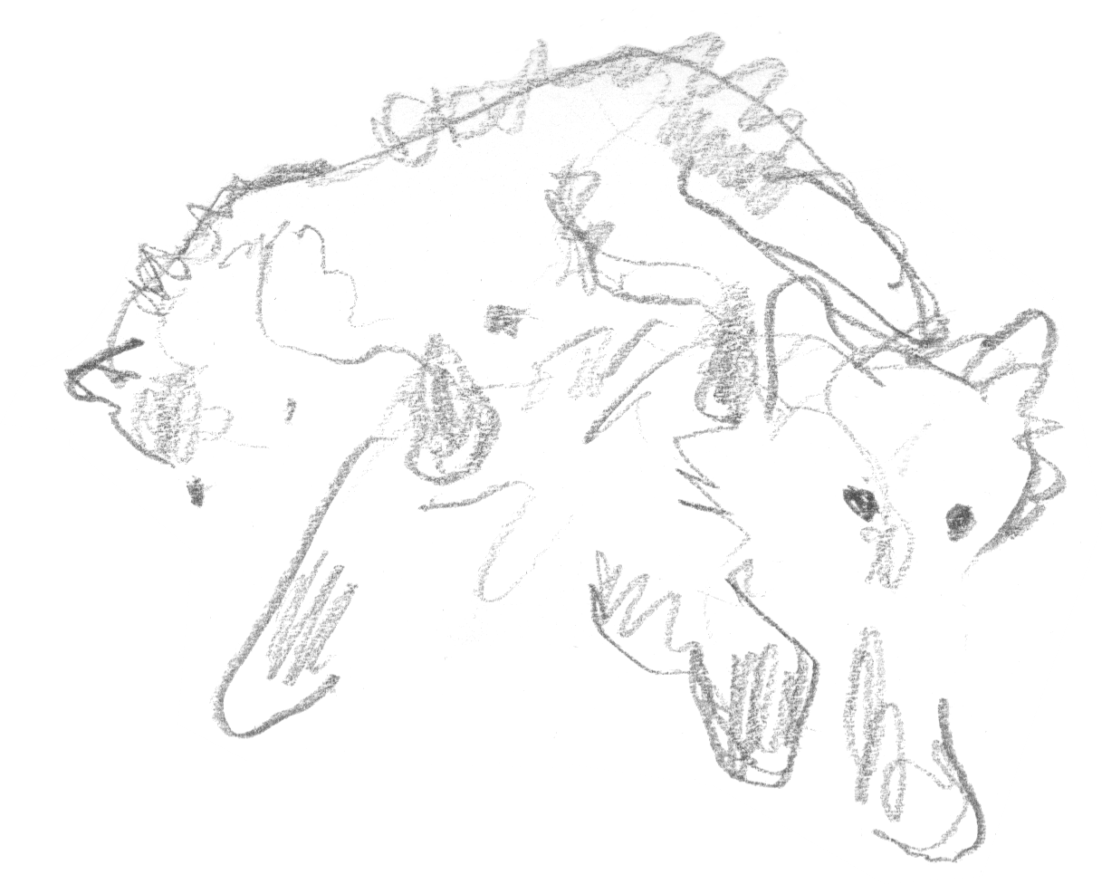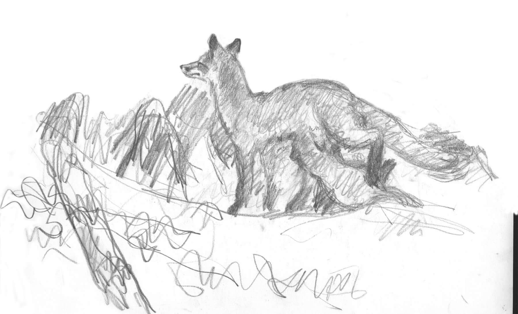 Le petit rentre au trou et la renarde seule s’endort. Elle a l’oreille gauche déchirée. Elle est enroulée sur elle-même et je peux la dessiner à loisir. Parfois, les cris d’un geai la réveillent, puis elle se couche à nouveau et se rendort, montrant ses belles mamelles au soleil.