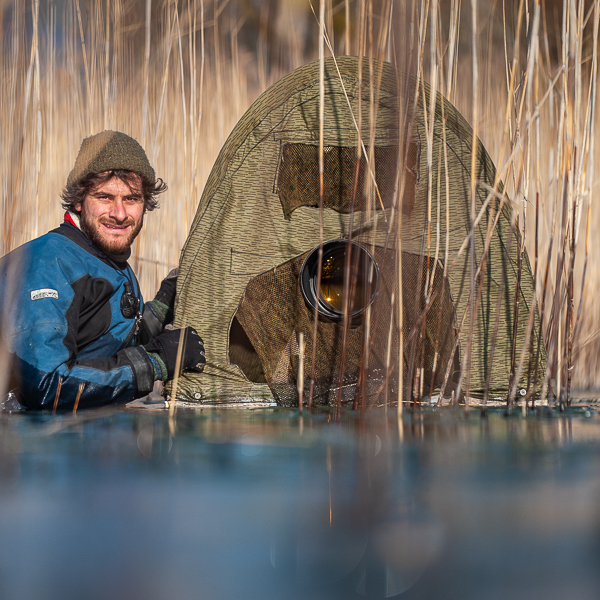 J’ai toujours eu ce désir de m’approcher, d’être au plus près d’eux. Un jour, j’en ai eu assez de les photographier depuis la rive. J’ai voulu avoir un point de vue original, à fleur d’eau. J’ai construit mon premier affût flottant et là, tout a changé. C’était l’euphorie, je me disais « je suis enfin un canard » (rires). J’étais fasciné par la lumière que je découvrais, en étant dans l’eau, les ombres disparaissent, le lac est un superbe miroir géant.
