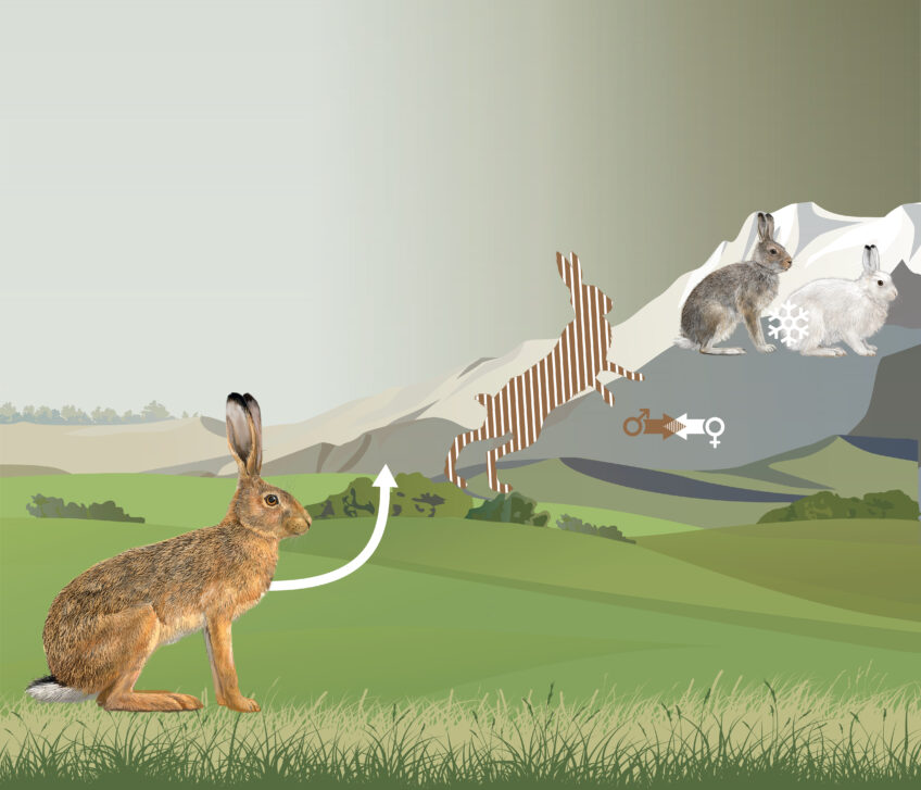 Véritable relique de la dernière glaciation, le lièvre variable a trouvé refuge dans les Alpes au moment du grand dégel. Adapté au froid et à la neige, il subit la hausse des températures qui le pousse toujours plus haut en réduisant les territoires favorables.