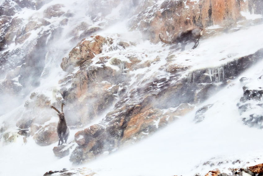 Tant mieux, ce sont souvent elles qui donnent l’alarme les premières. C’est la seule période de l’année où, accompagnées des jeunes de l’année, elles fréquentent les mâles adultes. Je suis admiratif devant l’adresse de ces équilibristes, alors que je peine à parcourir quelques mètres avec tout mon matériel. Bien que leurs sabots agissent comme de véritables semelles antidérapantes, il arrive que certains soient emportés dans les avalanches ou ne résistent pas à la morsure du froid. Je longe la falaise et distingue deux boucs, les yeux fermés, faisant bloc contre les tourbillons de glace qui les frappent. J’en profite pour immortaliser l’instant, tandis que je lutte aussi pour rester en équilibre contre la paroi minérale. En redescendant à ma voiture, je ne peux m’empêcher de penser à eux. Les reverrai-je l’an prochain ?