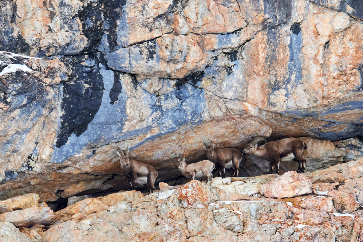 À l’aube, le vent souffle toujours intensément, mais pas assez pour me décourager. Après tout, mon but est de documenter comment ces capricornes affrontent les éléments. Après une marche d’approche par faible visibilité, j’arrive à une barre rocheuse et distingue un troupeau de ces alpinistes hors pair.