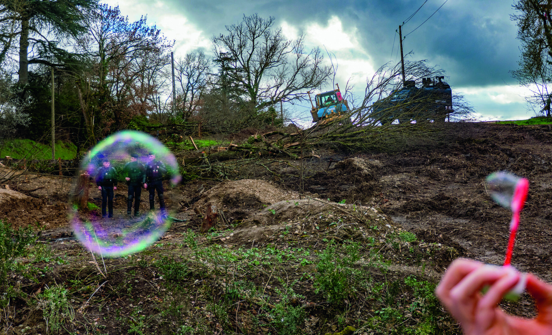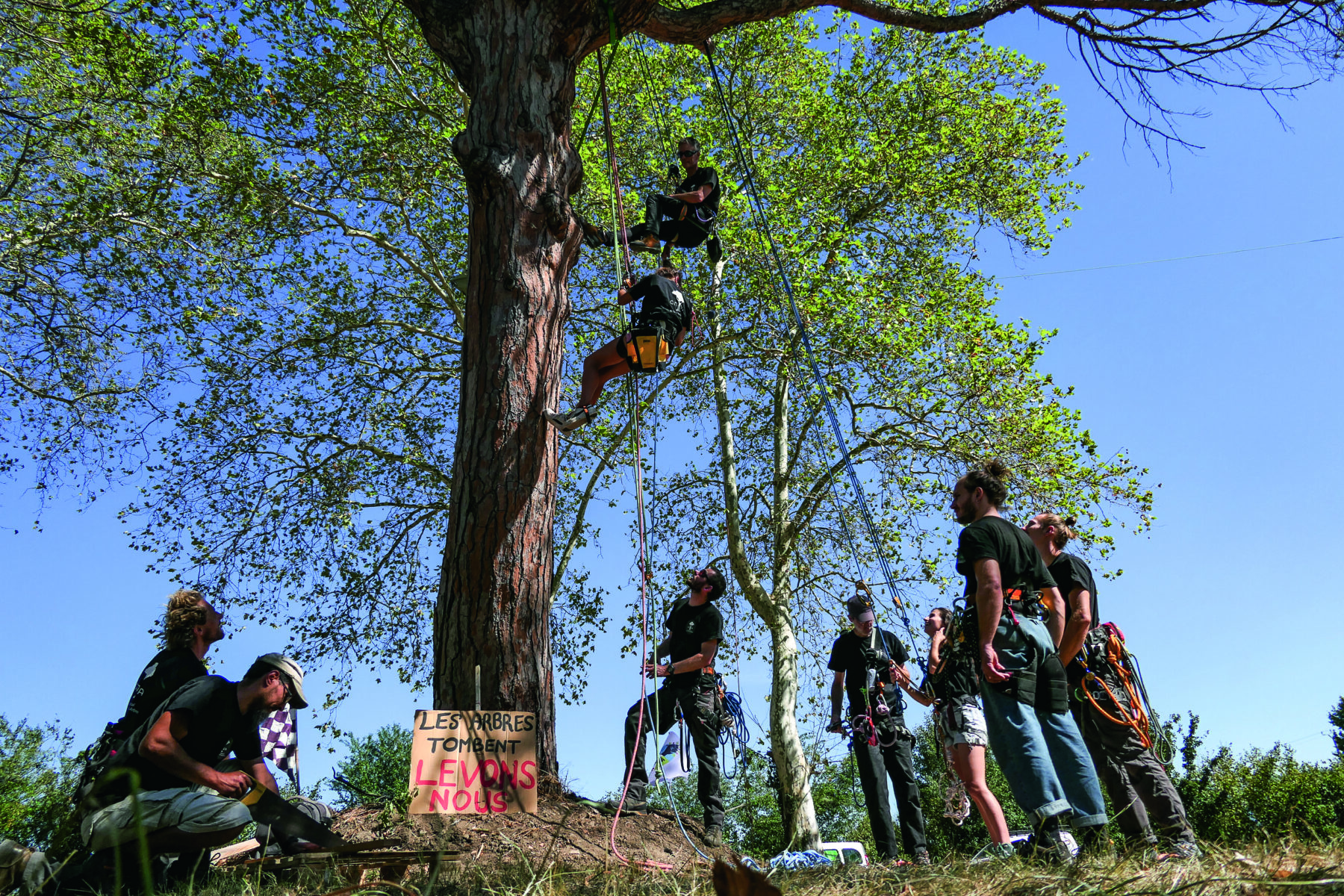 Cette destruction du vivant a donné envie à Clara de passer à l’action. Botaniste de formation, elle voulait mettre ses compétences au service de la nature. Clara est une écureuil, le nom donné aux militants arboricoles. Elle monte dans les arbres pour empêcher qu’ils soient coupés. « J’ai vécu de réels moments de méditation et de communion avec un chêne pédonculé. Chaque seconde était précieuse puisque je savais qu’il allait être coupé tôt ou tard. » Le soir, elle descendait prendre un repas chaud chez Fanfan, à quelques pas, qui remplissait la fonction d’abeille nourricière. Autour de la table, les militants viennent d’horizons différents. Style tout terrain, ils ont adopté les bottes ou les chaussures de marche. « L’État nous voit comme des écolos idéalistes déconnectés des réalités du territoire, mais on l’habite et on le connaît ! », lance Sylvie, engagée sur le volet juridique au sein du collectif La Voie est libre. « Nous avons joué de la musique aux pieds des arbres, ça aussi ça réenchante la lutte ! », lance Courroux avec un grand sourire. Pour ce militant qui a occupé les fonctions d’écureuil et de castor - le rôle du bâtisseur dans la lutte - l’annonce du démarrage du chantier a été un choc. Il a vite troqué sa fourche de maraîcher pour un appareil photo afin de documenter ce combat. « Je me souviens d’un écureuil, un vrai (rires), qui venait nous engueuler parce qu’on était dans son arbre. Ou d’une nuit où j’ai vu une genette en quittant le chantier… magique ! »