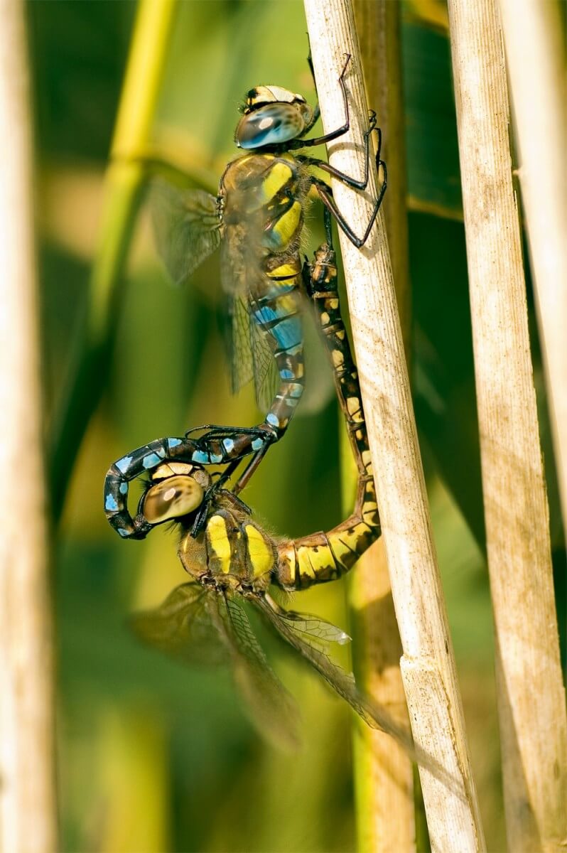 Une fois matures, les libellules mâles ne s'embarrassent pas de parades nuptiales. Seuls les caloptéryx volent sur place devant les femelles en exhibant leur abdomen. Chez les autres espèces, point de simagrées ! Certains mâles se postent à proximité des sites de ponte et attendent l'arrivée des femelles. D'autres opèrent des patrouilles incessantes le long des berges en quête d'une dulcinée. Une fois l'élue aperçue, elle est poursuivie sans merci et littéralement capturée. Chez les zygoptères, l'amant impatient la saisit au niveau du prothorax avec ses appendices situés à l'extrémité de son abdomen. Chez les anisoptères, c'est derrière les yeux que le mâle s'accroche à sa conquête. Mais acceptera-t-elle l'accouplement ?