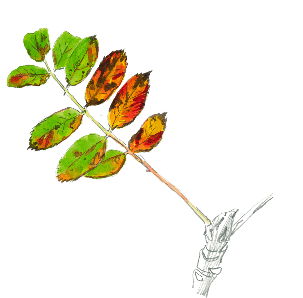 Au mois d’octobre, le sorbier des oiseleurs a commencé à maquiller ses feuilles de taches jaunes, brunes ou rouges. Le plus étonnant, c’est qu’elles ne changent pas d’un seul tenant. Elles se débarrassent aléatoirement de leur couleur verte et laissent apparaître d’autres pigments. Il en résulte une mosaïque de couleurs qui fait de chaque feuille une œuvre d’art et donne au sorbier l’éclat d’un feu d’artifice.