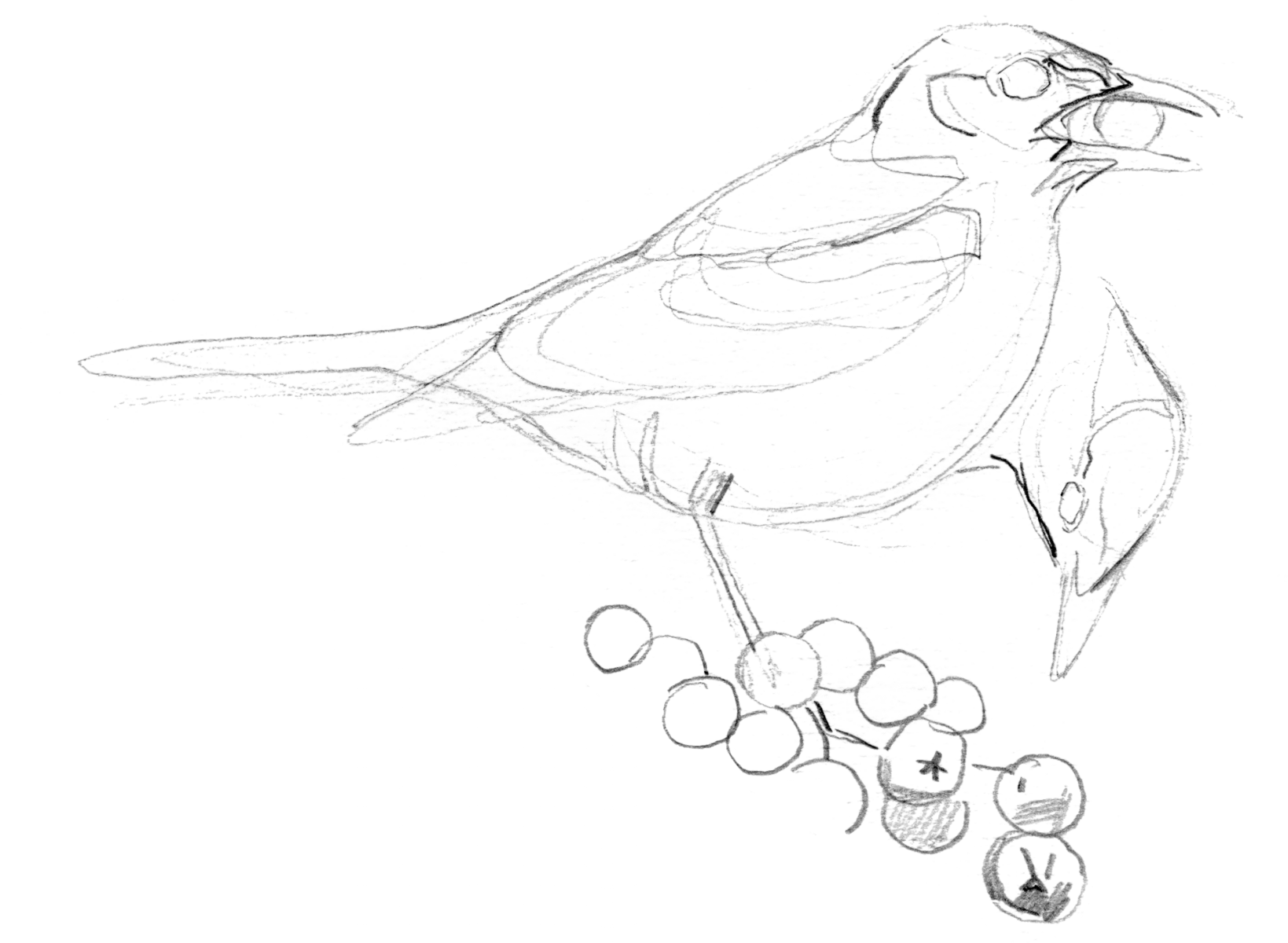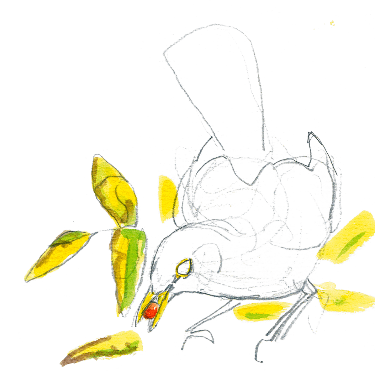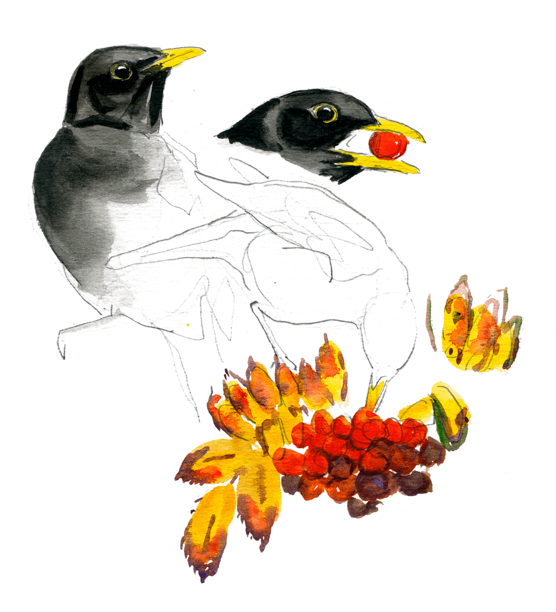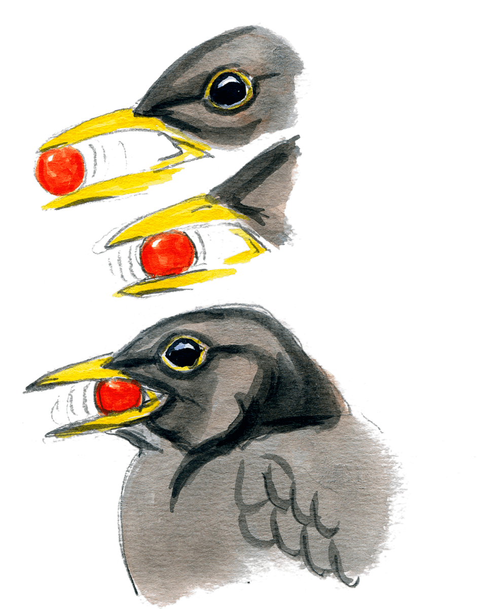 C’est le merle qui préside. Il ne se gêne pas pour se produire en spectacle. En équilibre, il essaie d’atteindre les fruits pulpeux en faisant ployer le rameau. Puis, d’un coup de bec adroit, saisit une baie et s’envole sur une branche plus sûre. Il la fait alors rouler d’avant en arrière dans son bec… et hop ! Elle est gobée.