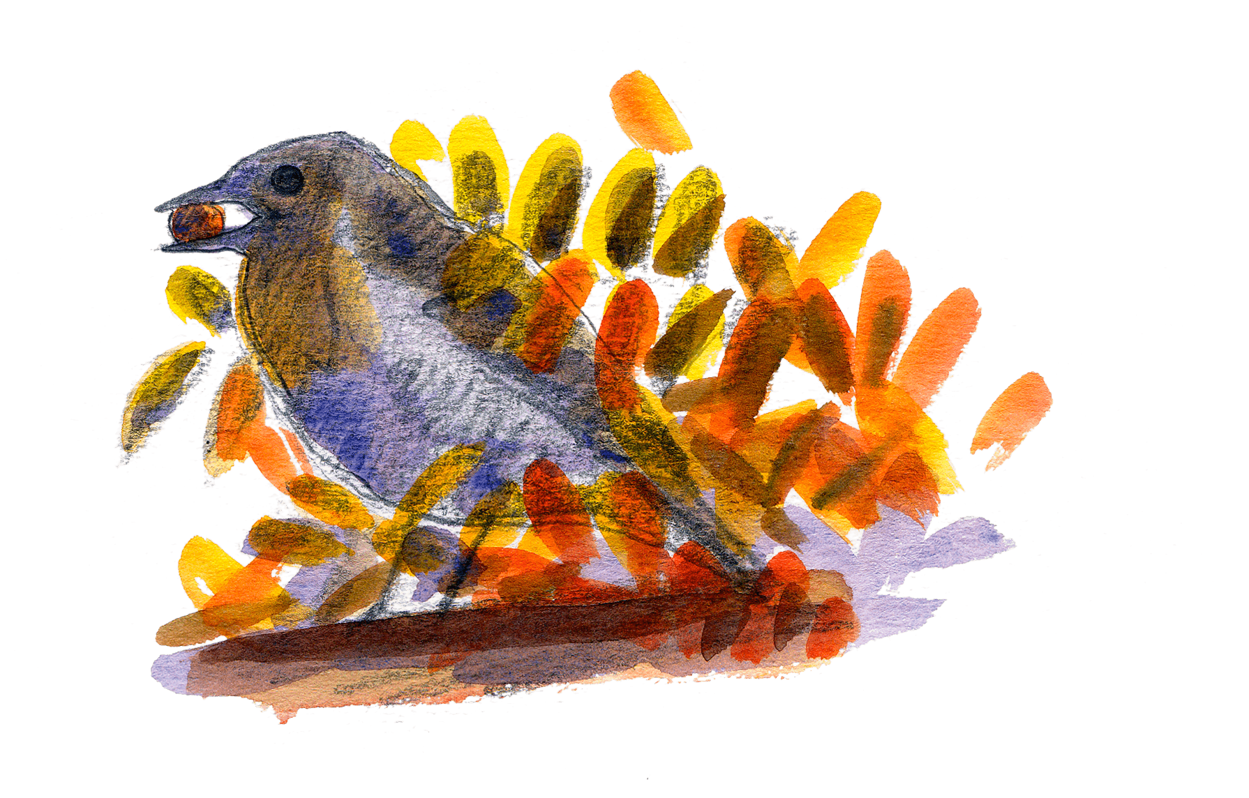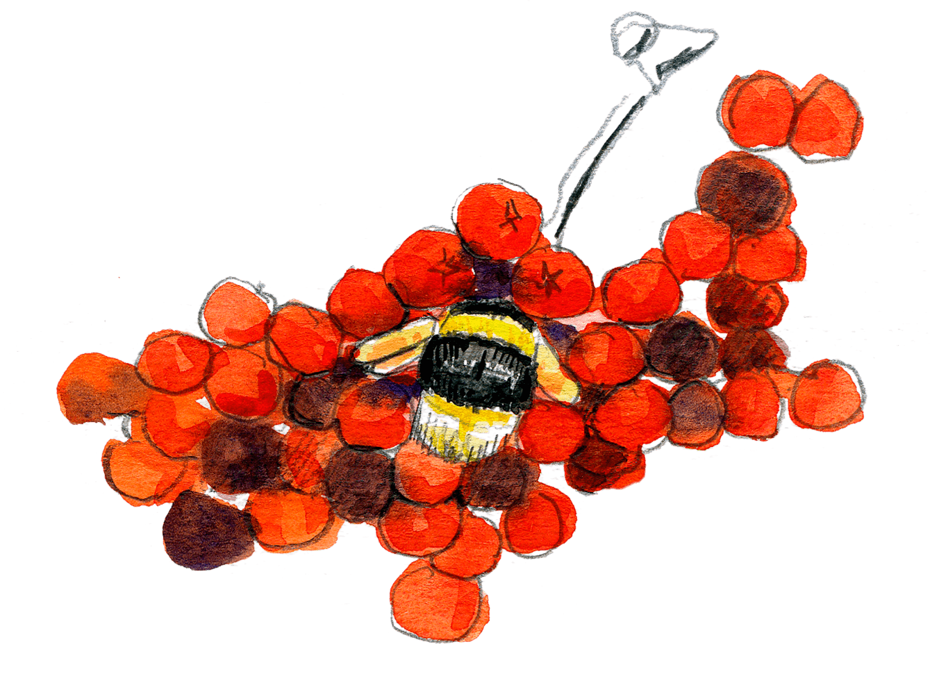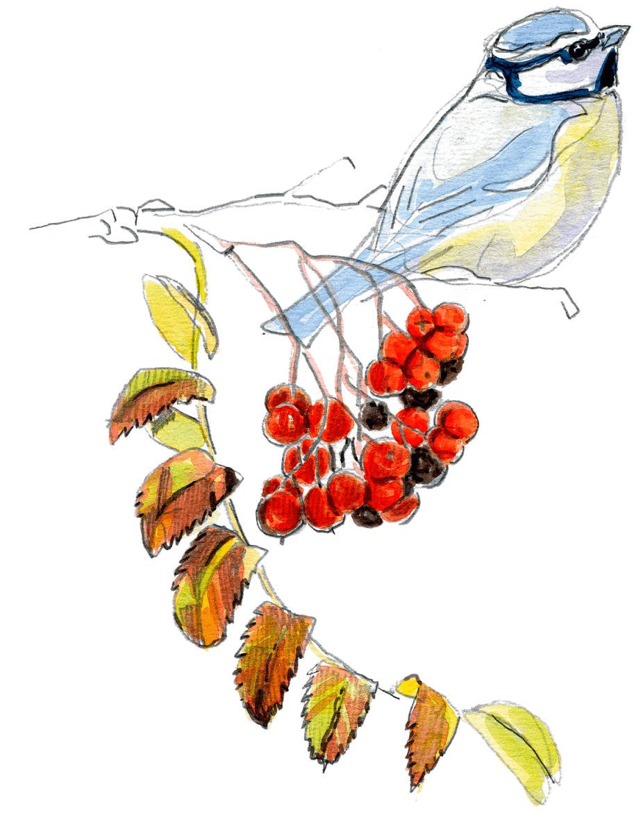 Déjà arrivent les premiers gourmands. Un rougegorge se pose sur les branches basses et s’empresse de saisir un fruit avant de s’envoler plus loin sous un cornouiller. Un court instant, sa gorge se fond parfaitement parmi les baies écarlates. Une autre boule de plumes s’agite un peu plus haut dans la frondaison. La mésange bleue hésite. Quel fruit semble le plus mûr ? Après une minutieuse inspection, elle commence son repas. Une reine de bourdon terrestre s’arrête un instant sur une grappe. Croyait-elle boire le nectar d’une dernière fleur avant de passer l’hiver sous terre ?