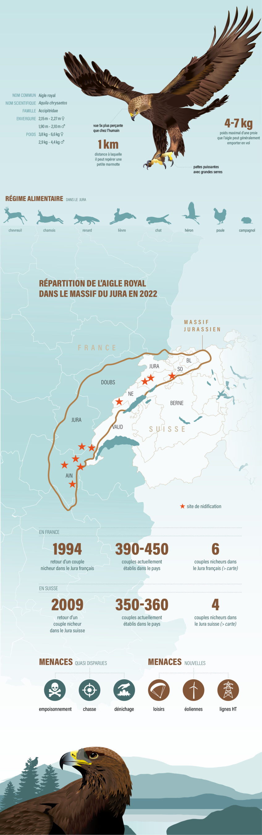 Alors qu’il avait disparu de la montagne jurassienne au début du XXe siècle, l’aigle royal est de retour. Depuis bientôt trente ans, ce majestueux rapace recolonise lentement les falaises et les forêts du massif à partir des Alpes voisines. Point de situation, alors que le cap symbolique des dix couples vient d’être franchi.