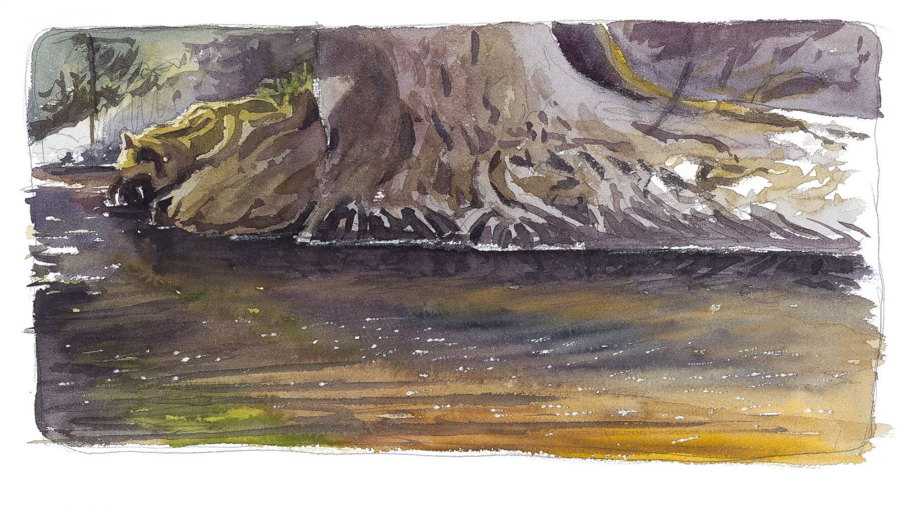 J’avais envie de saisir la pêche du héron au crépuscule, ou l’impressionnante violence avec laquelle une truite peut gober un insecte. J’ai observé plein de choses. Mais les dessiner, c’est une autre paire de manches ! J’avais l’avantage de bien connaître les lieux. Alors, tout en appréciant toujours plus ces visites répétées au même endroit, j’ai tenté la variation sur un seul et unique thème. L’eau, toujours à l’aquarelle, ses éclats, ses lumières.