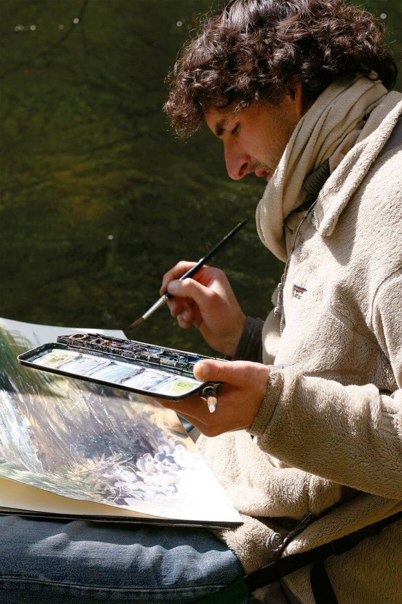 Depuis l’enfance, sa passion pour les oiseaux le pousse à dessiner dehors par tous les temps. Son pinceau restitue ici les reflets et remous d'une rivière.