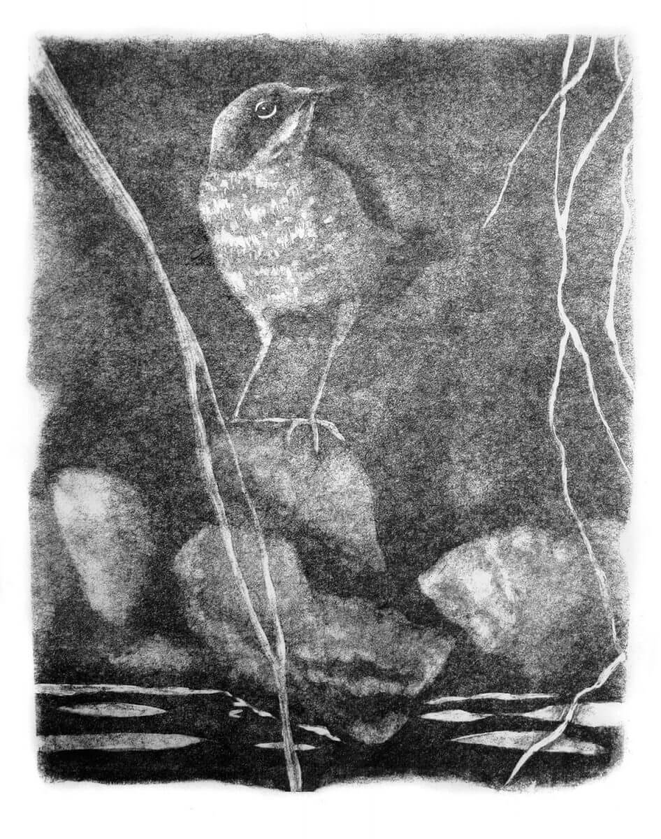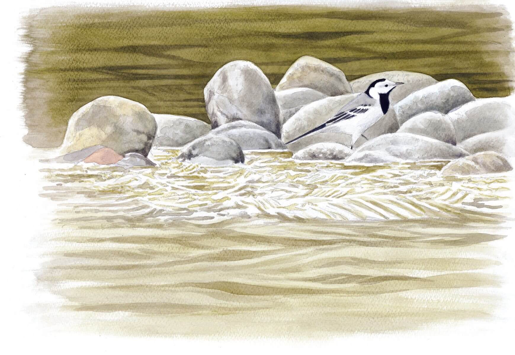 « Quand, loin de mes cours d’eau familiers, j’ai découvert cet endroit, les oiseaux ont tout de suite capté mon attention. En particulier la bergeronnette des ruisseaux qui incarne pour moi la légèreté de la rivière. Ce travail m’a donné l’occasion de redécouvrir ce passereau trop peu souvent dessiné. J’ai eu la joie de trouver son nid et d’observer les nourrissages de ses jeunes. Pour évoquer la rivière, j’ai choisi tout naturellement de saisir quelques animaux en lien direct avec l’eau. Après la bergeronnette, une famille de cincles dont un jeune reproduit en gravure.